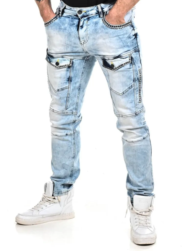 Jeans Med Nitter Fra Cipo &Amp; Baxxcool Bukser I En Bleget Denim, Der Har Nitter Og Markerende Sømme. Dette Er En Elastisk Model, Der Besidder En Normal Pasform. Disse Bukser Er Designede Med Fem Klassiske Lommer Og To Lommer Fortil, Der Begge Har Knaplukning.