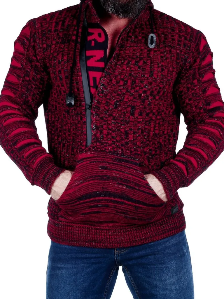 Trøje I Strikket Materiale Fra Rusty Nealhøj Hals Med Snøre Og Lynlås. Åbner Manaven Ses En Strikket Tekst Som En C…