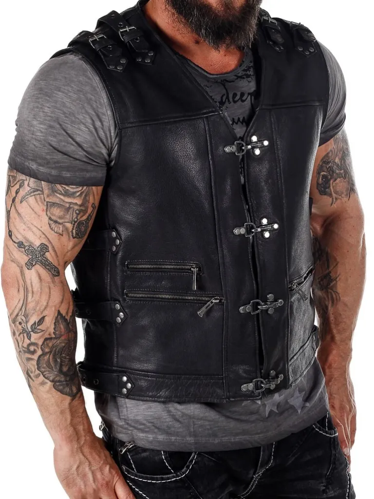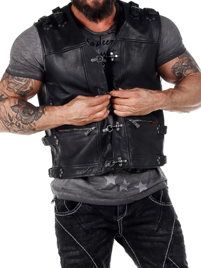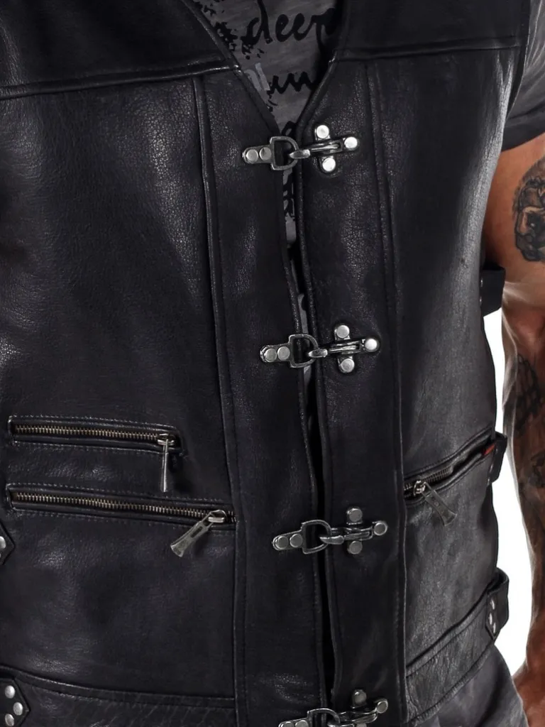 Tung Vest I Ægte Skind Med Rå Detaljer!Sort Skindvest Med Nitter I Et Sølvskinnende Materiale, Lynlåse Og Remme. Maskulint Design Med Markerede Skuldre, V-Udskæring Foroven Og Regulérbare Spænder På Siderne. Materialer Er Groft Og Tåleligt. Der Findes To Inderlommer Og Tre Lommer Fortil, Som Kan Lukkes Ved Hjælp Afaftige Lynlåse.