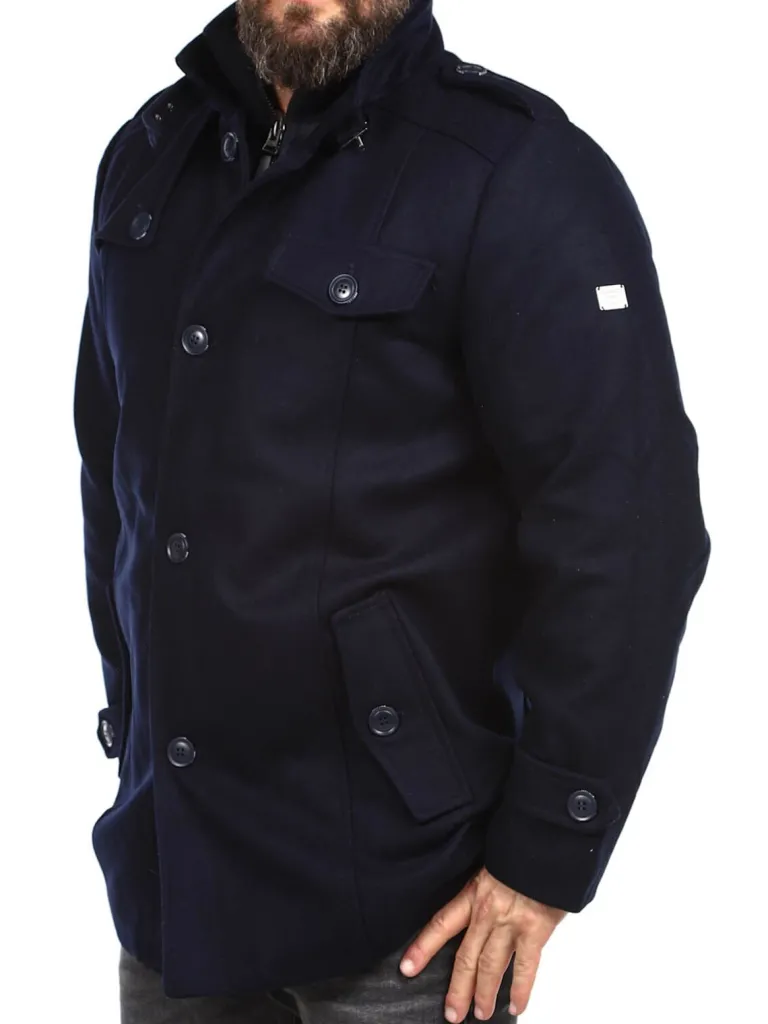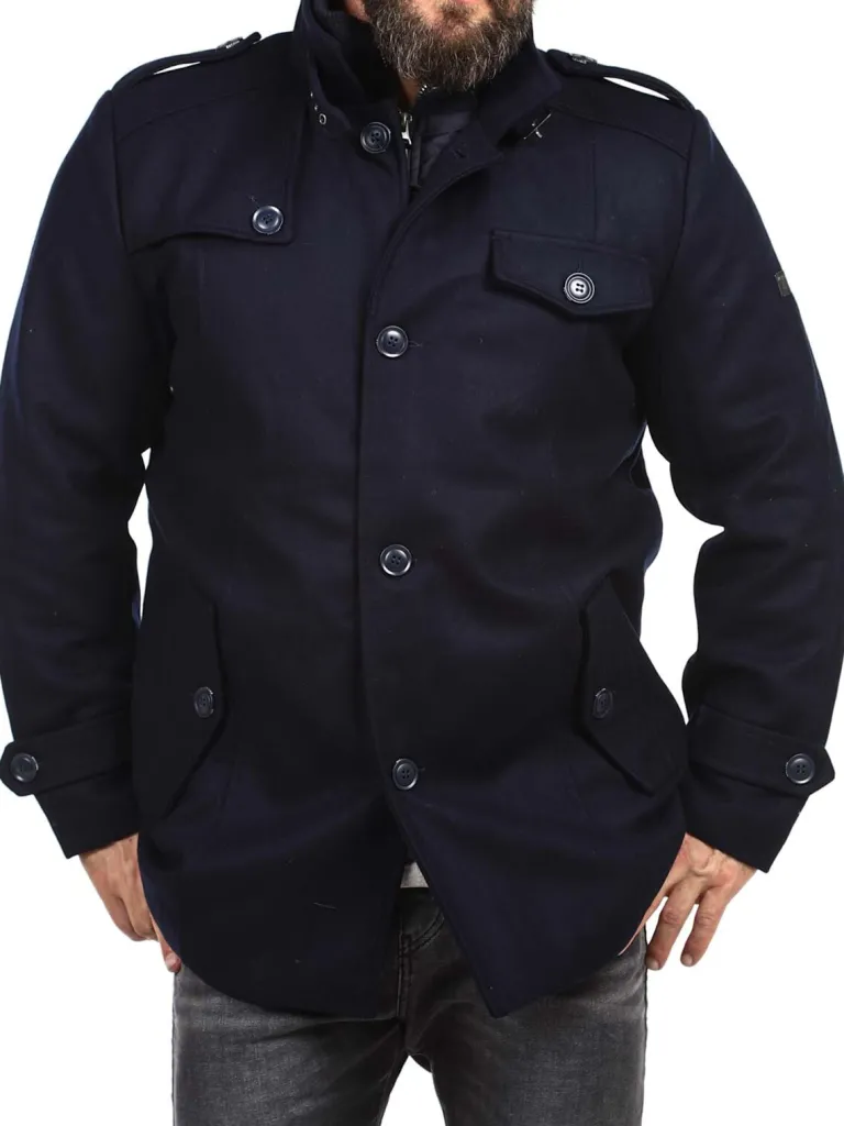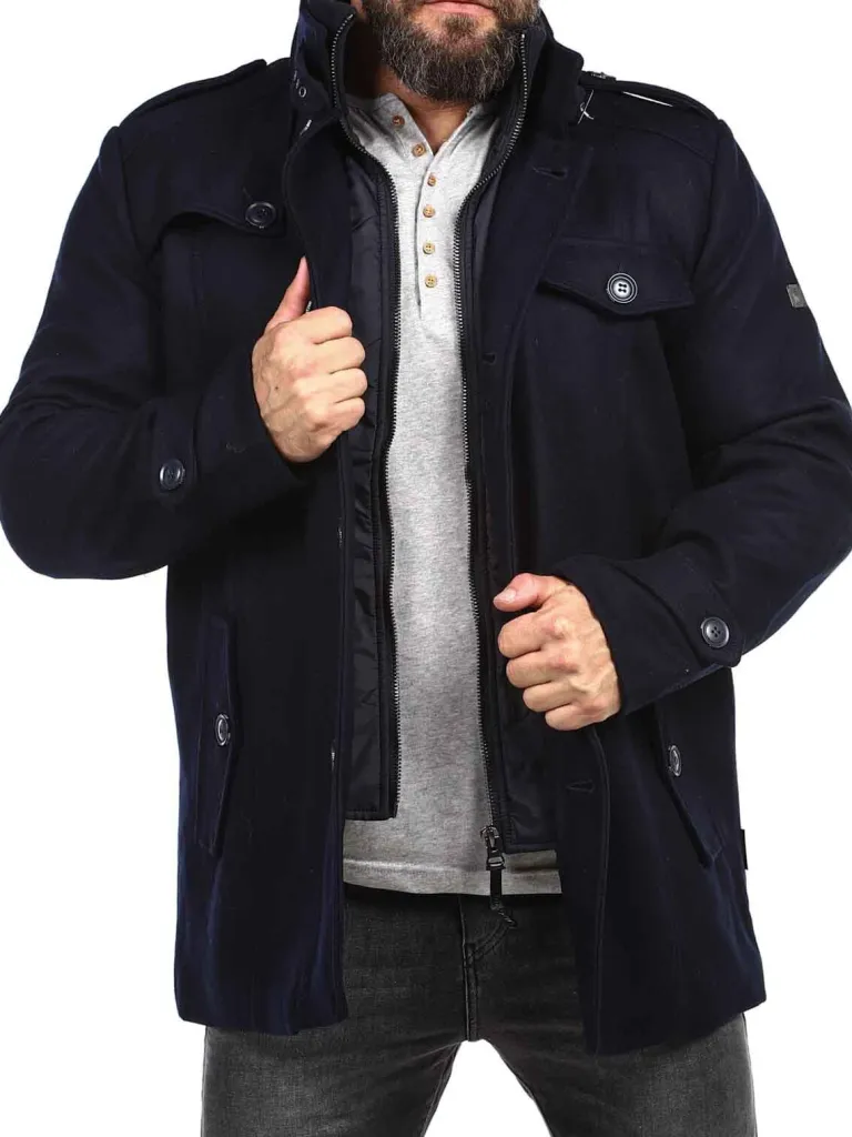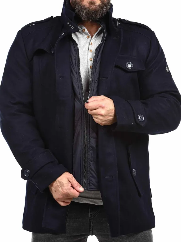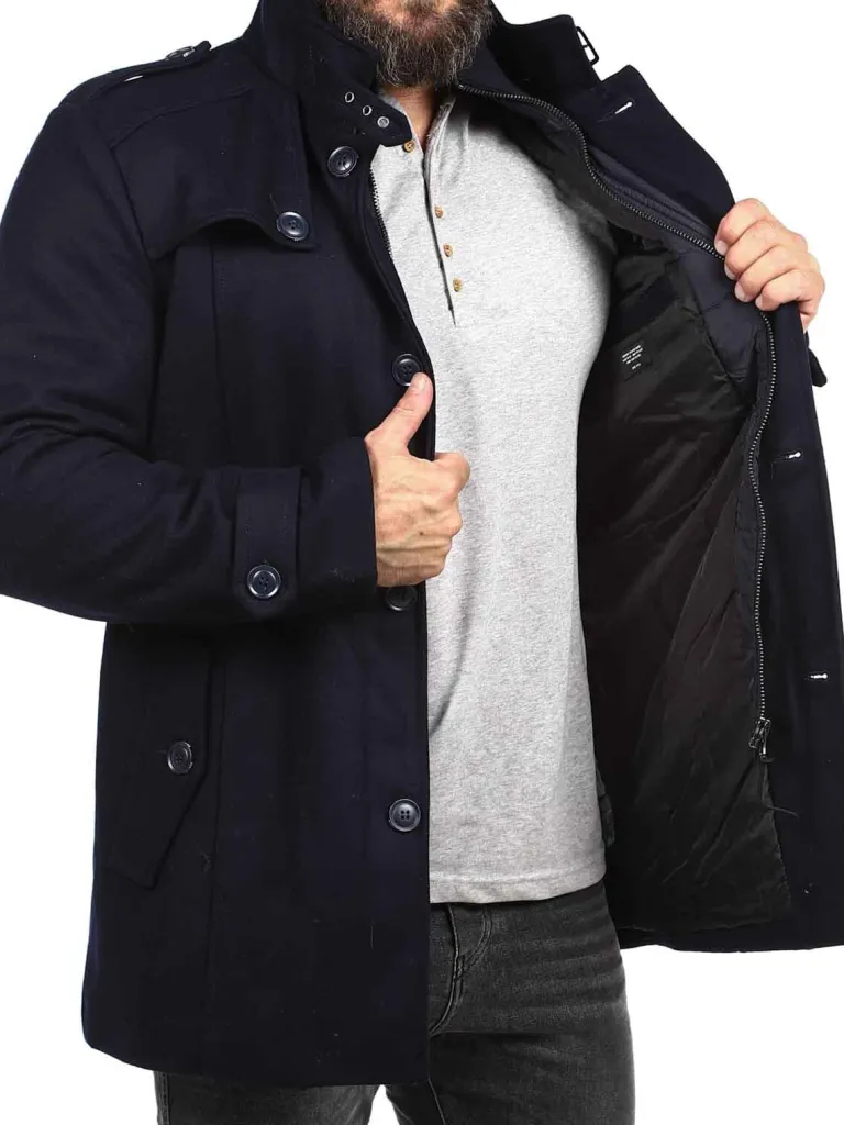 Vinterfrakke I En Uldblanding Fra Indicodeflot Vinterfrakke I Mørkeblåt. To Lommer På Maven, Som Kan Lukkes Med Knap, Og Én Åben Inderlomme. Jakken Lukkes Med Lynlås Og Knapper. Høj Hals, Som Kan Lukkes Helt Op Med Lynlås, Så Vind Og Sne Ikke Kan Komme Ind.