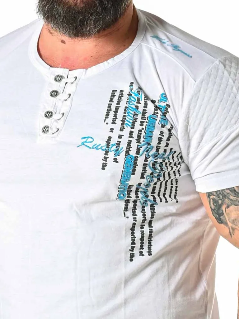 T-Shirt Med Knaplukning Fra Rusty Nealskøn T.Shirt I Blødt Bomuldsmateriale Med Stretch I. Detaljeret Med Knapper Ved Halsen, Teksttryk, Kontraststof På Skuldrene Og Logoet På En Metalpatch I Taljen Forneden. Glem Ikke, At Den Findes I Flere Farver!