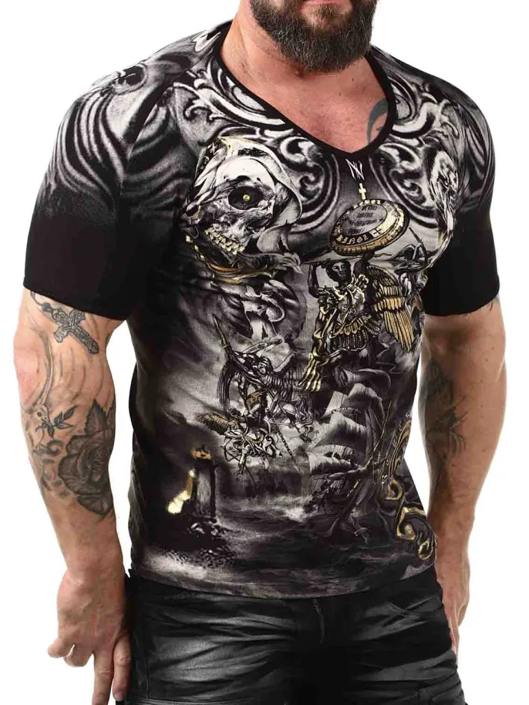 V-Ringet T-Shirt Med Tryk I Guldt-Shirt Med Sort Base Og Tryk Både Fortil Og Bagå I Grå Og Guld. Stram Model I Et Bek…