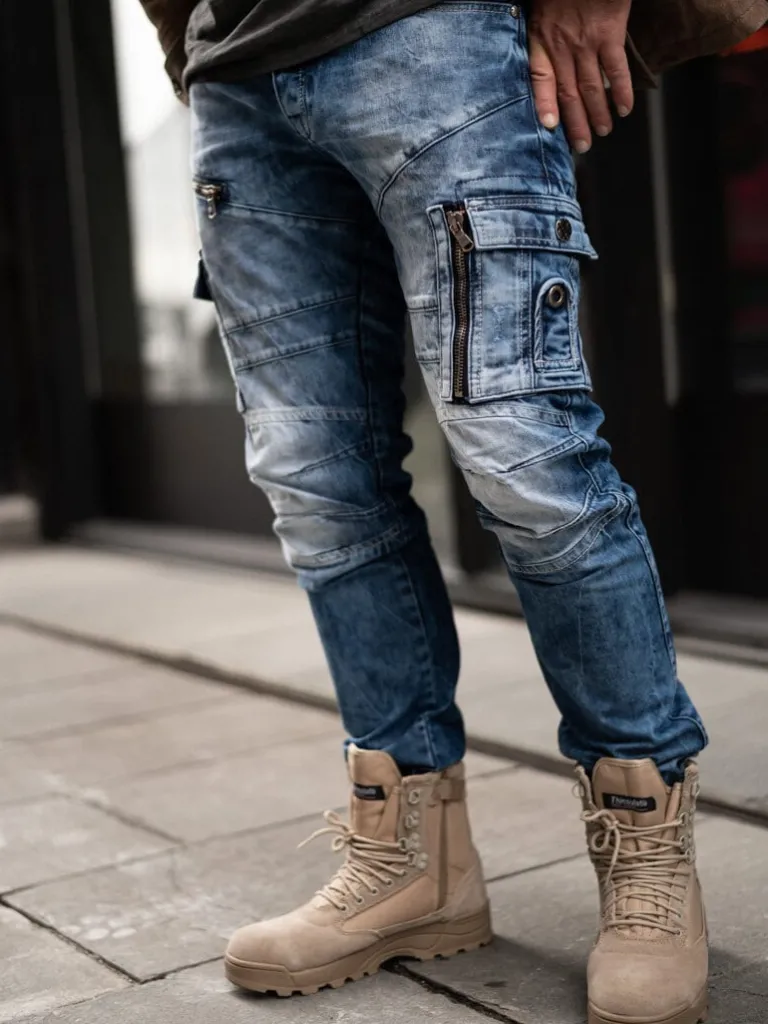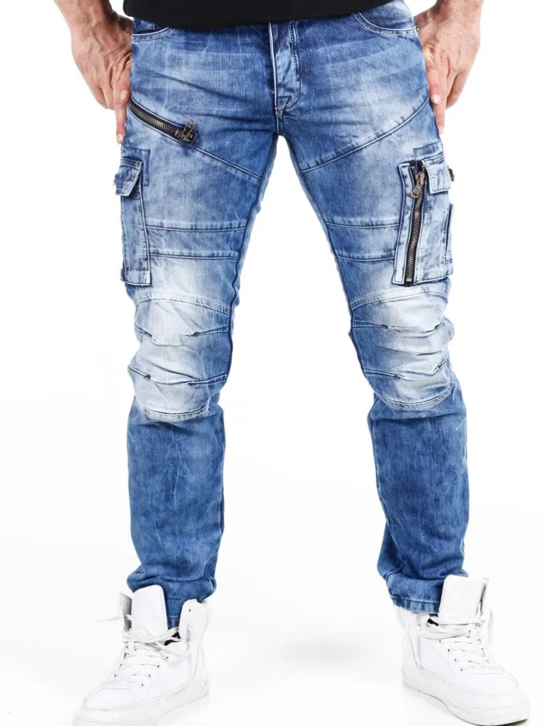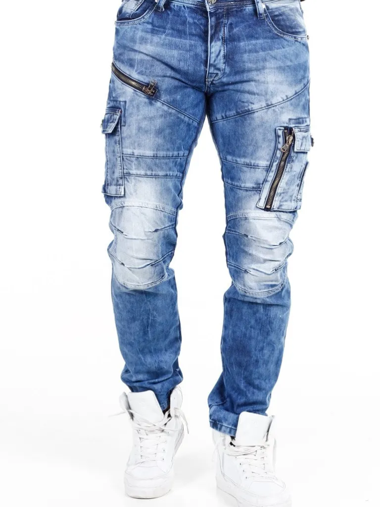 Cargojeans Fra Cipo &Amp; Baxxmellemblå Jeans Med Slitage, Nitter I Metal, Grove Lynlåse Og Lapper I En Sort Skindimit…