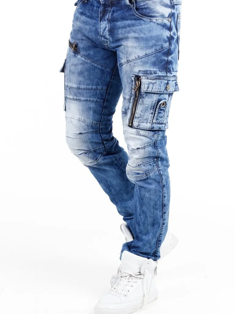 Cargojeans Fra Cipo &Amp; Baxxmellemblå Jeans Med Slitage, Nitter I Metal, Grove Lynlåse Og Lapper I En Sort Skindimitation Med Loget På. Disse Bukser Er Fremstillet I 100 % Bomuld, Og De Har Rummelige Lommer Bagtil, Tre Lommer Foran Samt To Cargolommer, Der Sidder På Benene.