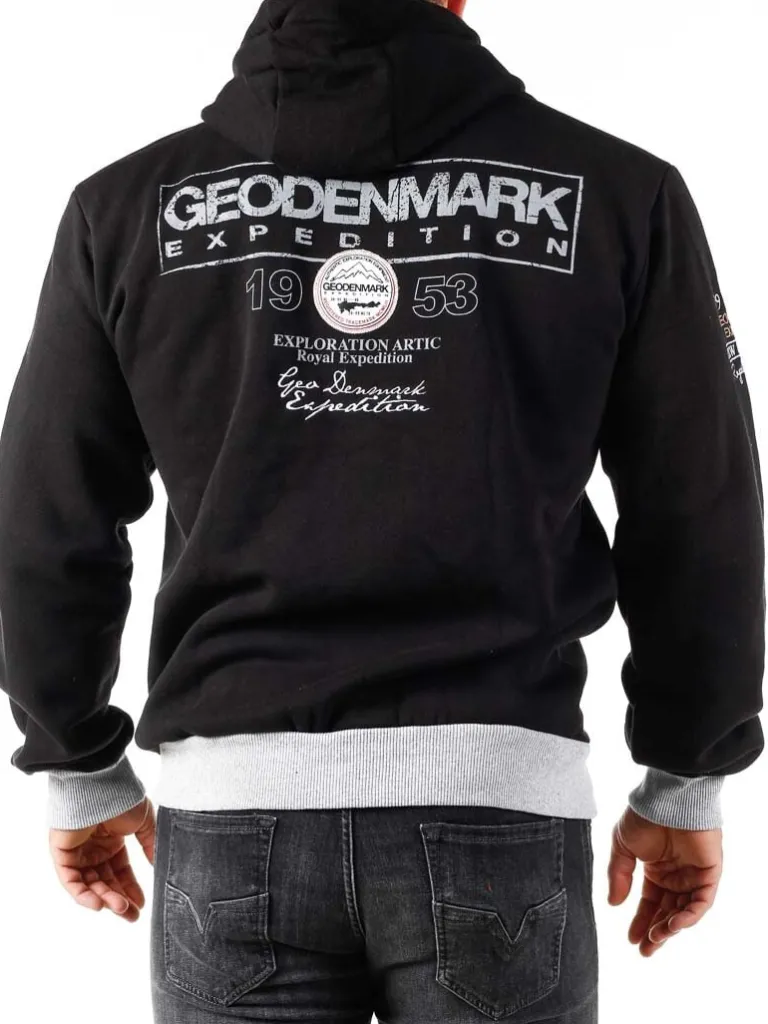 Sort Ziphoodie Fra Geo Denmarktrøjen Har En Rummelig Hætte, Lynlås Som Går Hele Vejen Ned Og Store Lommmer På Maven. Mærkets Logo Og Mønster Ses Både Fortil Og Bagpå, Og Den Har En Grå Ribkant Forneden Og Ved Ærmernes Slutning.