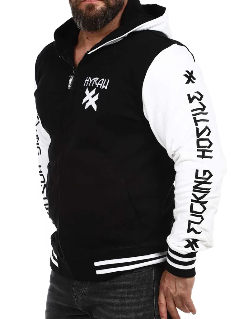 Zip Hoodie Fra Hyrawsort Og Hvid Trøje Med Hætte Og Lynlås. Den Har Et Cool Design Med En Tekst På Armene. Den Har To Åbne Lommer Fortil Og En Stribet Kant For Enden Af Ærmerne, Samt I Linningen Forneden.