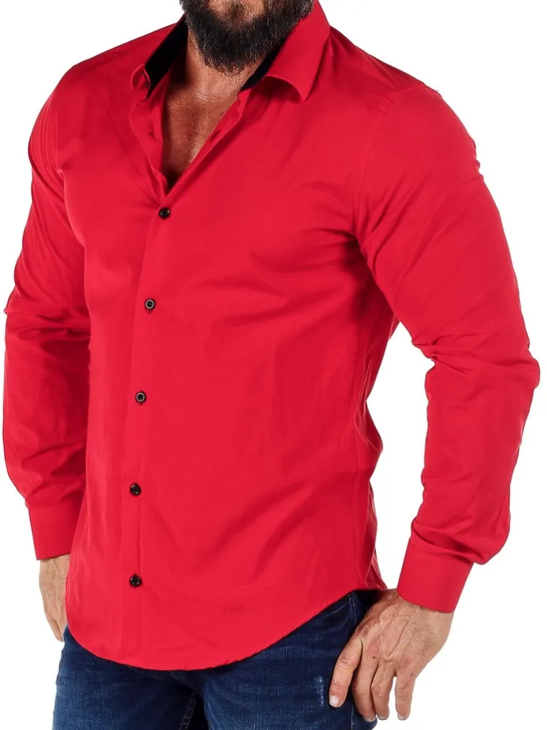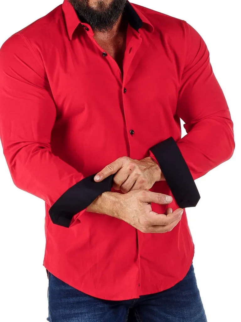 Rød Skjorte I En Slim Fit-Model Fra Rusty Nealbomuldsskjorte I En Bekvem Model, Som Er Noget Stretchig. Rød Base Med Knapper, Indvendigave Og Enderne Af Ærmerne I En Kontrastfarve. En Smallere Model Med Afrundet Linning Forneden Og Med Forstærketave, Som Holder Formen.