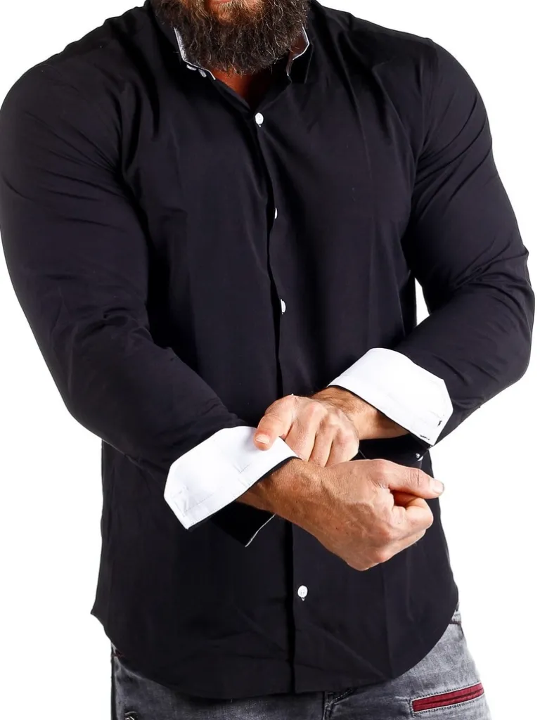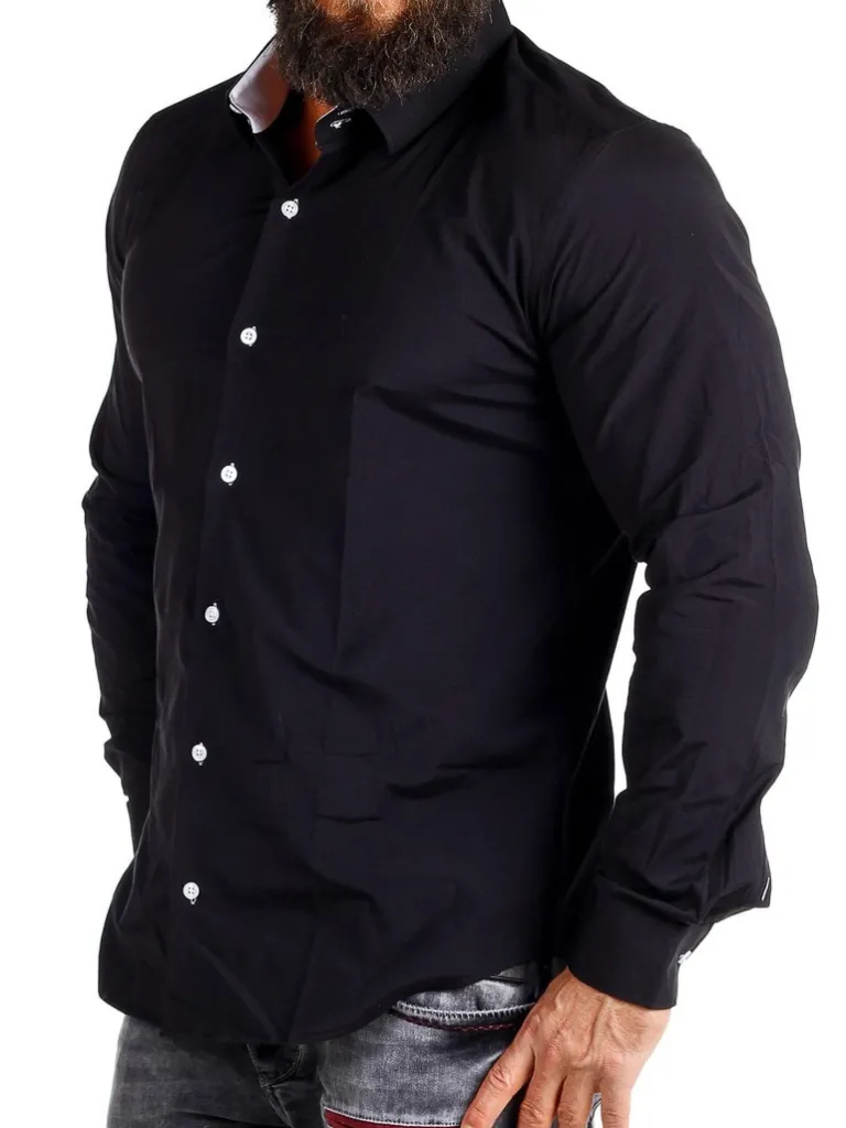 Sort Skjorte I En Slim Fit-Model Fra Rusty Nealbomuldsskjorte I En Bekvem Model, Som Er Noget Stretchig. Sort Base Med Knapper, Indvendigave Og Enderne Af Ærmerne I En Kontrastfarve. En Smallere Model Med Afrundet Linning Forneden Og Med Forstærketave, Som Holder Formen.