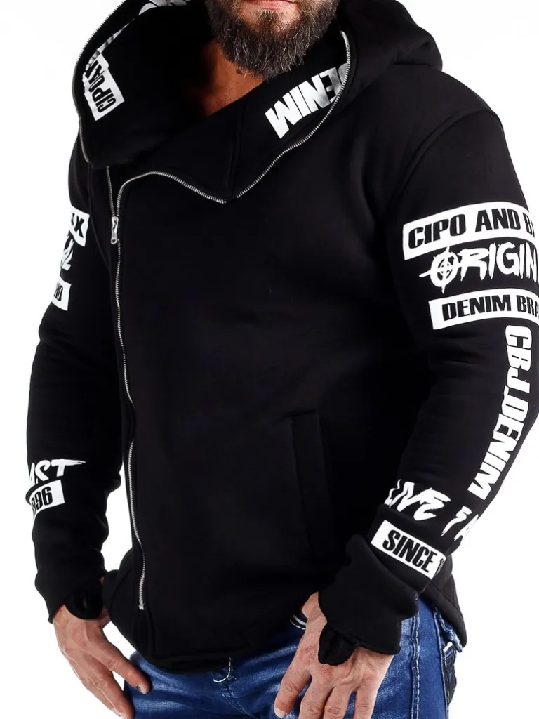 Sort Hættetrøje Med Hvidt Trykblød Hættetrøje Med Skrå Lynlås. Hvidt Tryk På Ærmerne Og På Indersiden Af Hætt…