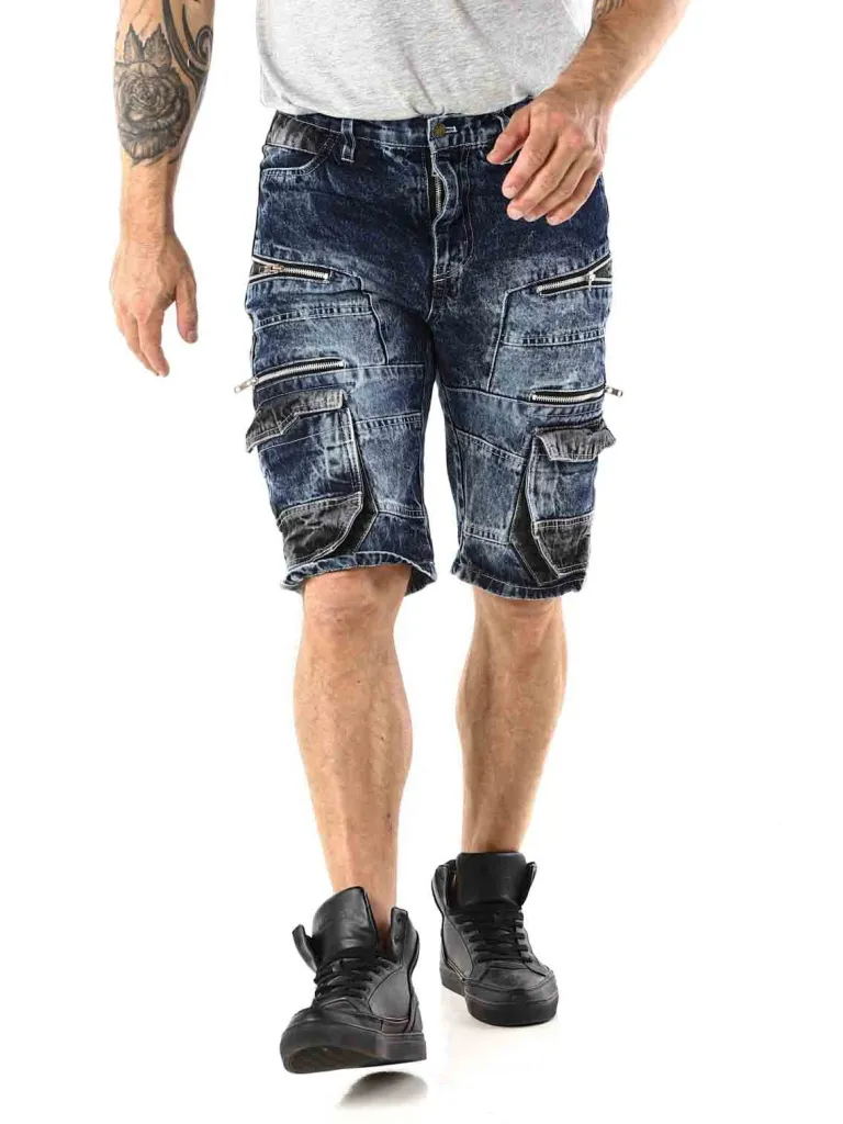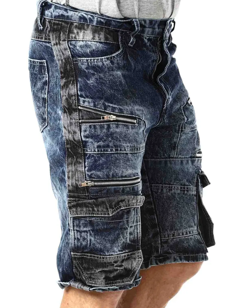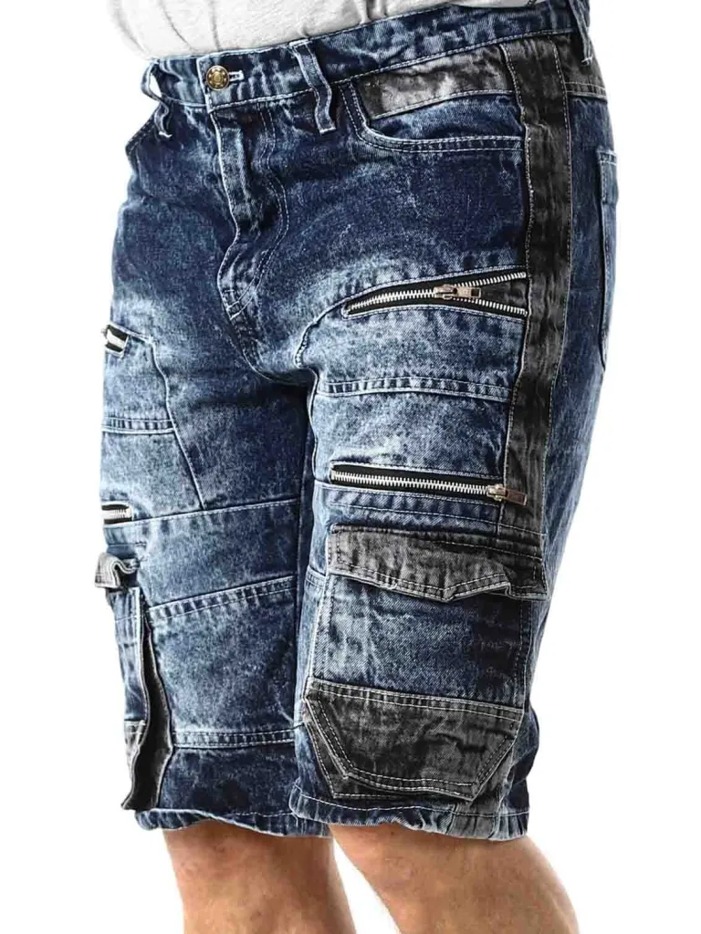 Cargoshorts Frashorts I En Blanding Af Blå Og Sort Denim. De Har Flere Lommer, Og Er Designede Med Lynlåse Fortil, Der…