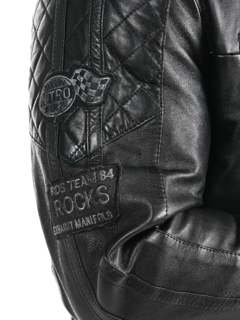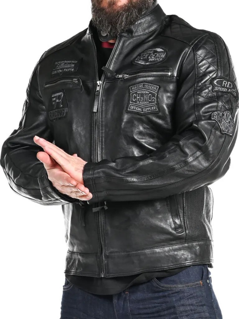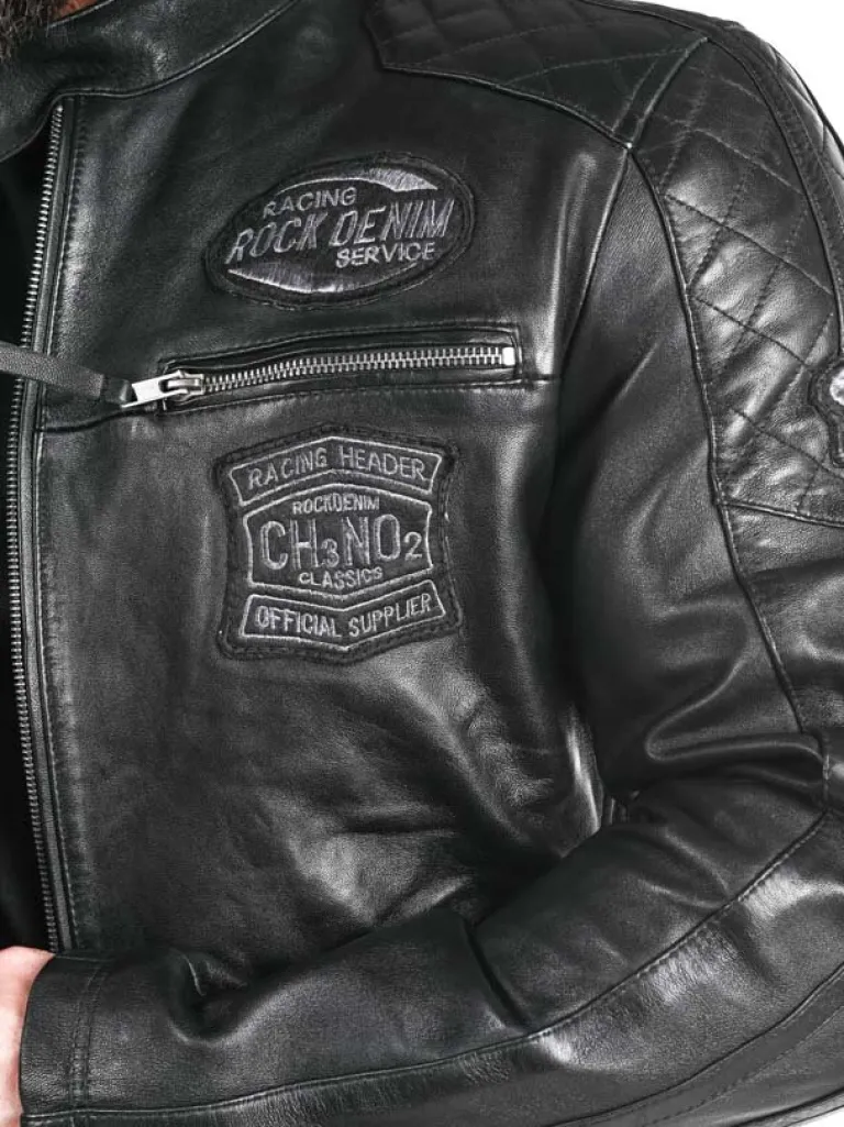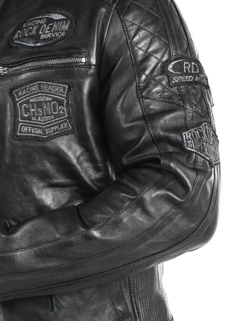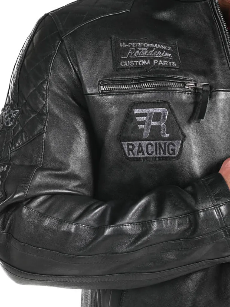 Racingjakke Fra sort Læderjakke I Ægte Læder Med Flotte Lapper. Den Har Et Quiltet Parti På Skuldrene, Og Er Funktionelt Udrustet Med Lommer, Der Kan Lukkes. Hertil Kommer Ender På Ærmerne Der Kan Justeres. Jakken Kan Endvidere Lukkes Med Trykknapper Ved Halsen. Denne Unikke Jakke Er Fremstillet I Et Kvalitetslæder, Og Er Desgignet Af Med Inspiration Fra Motorsporten.