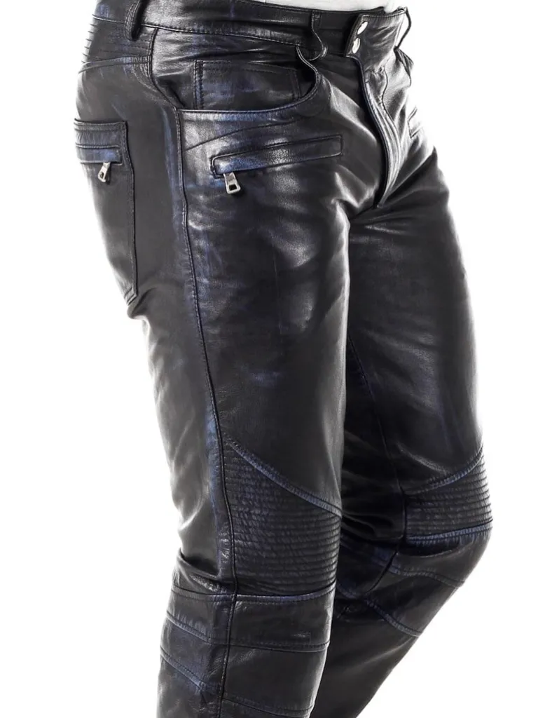Exklusiva Skinnbyxor Från svarta Skinnbyxor Med Blåa Inslag. De Har Flera Fickor, Både Öppna Och Stängbara. Biker-Inspirerad Design Med Klassisk Passform. Tillverkade I Mjukt Läder Och Fi