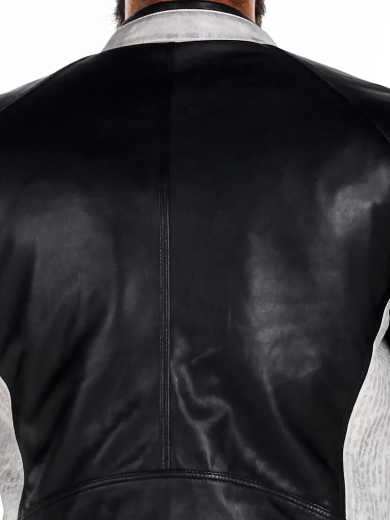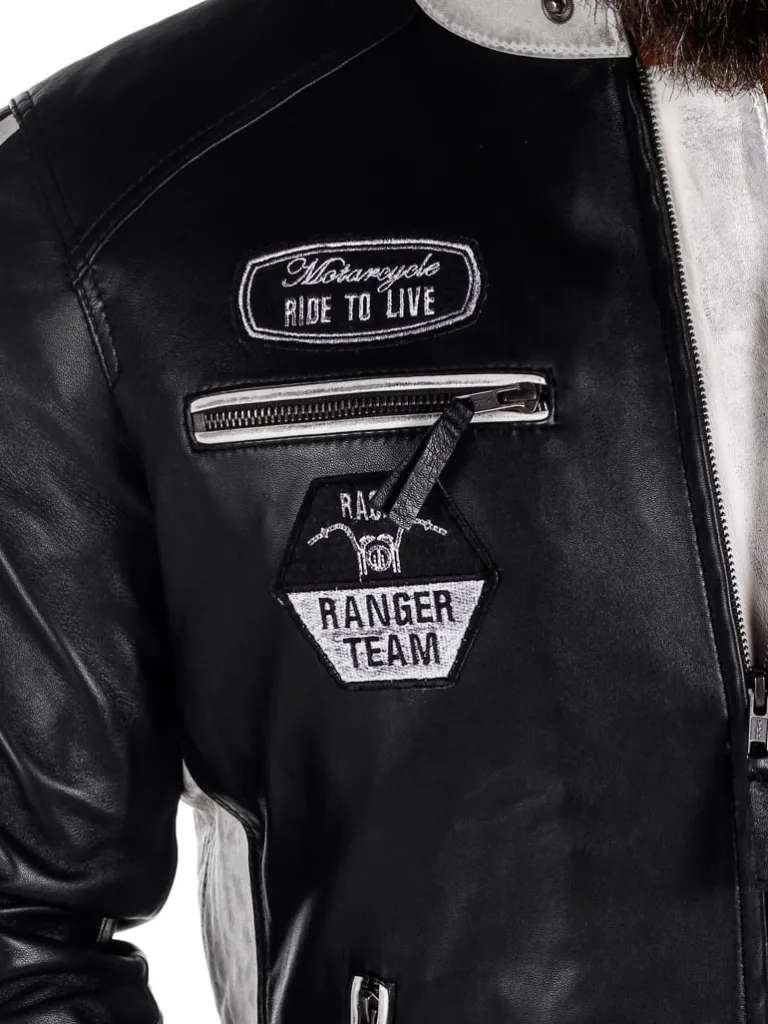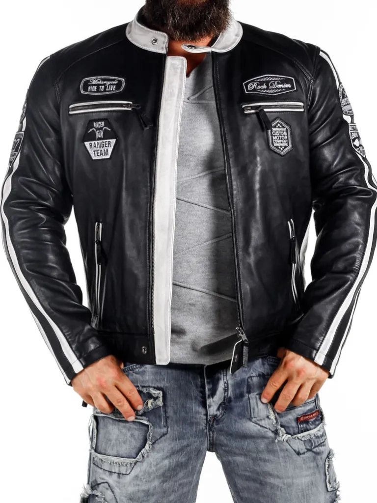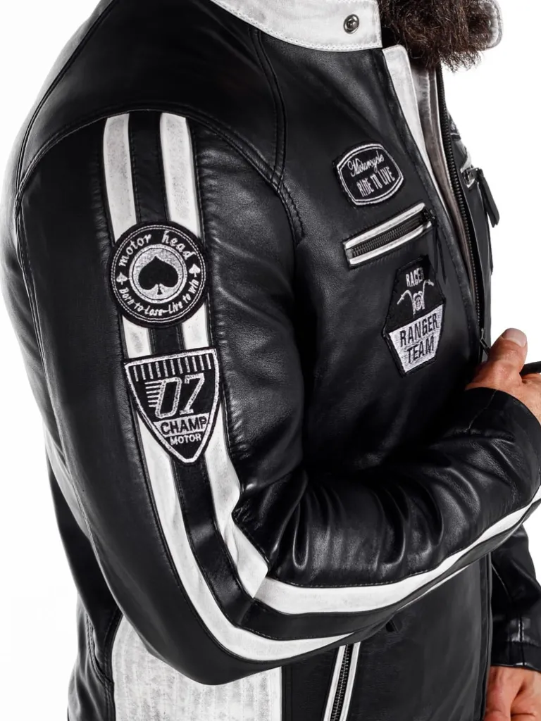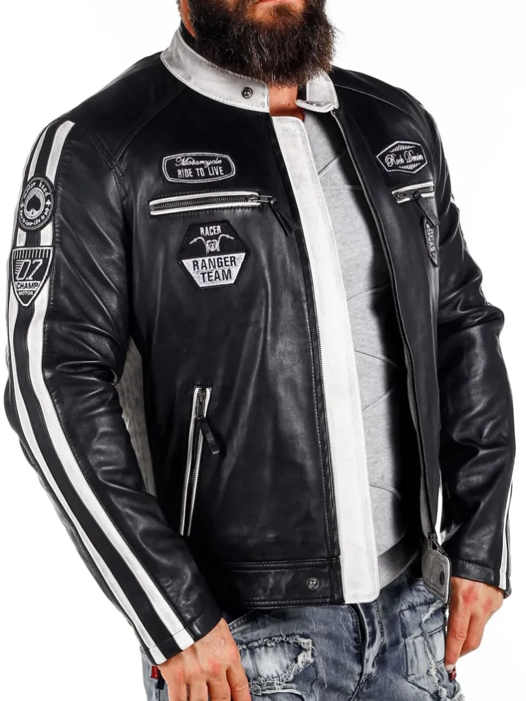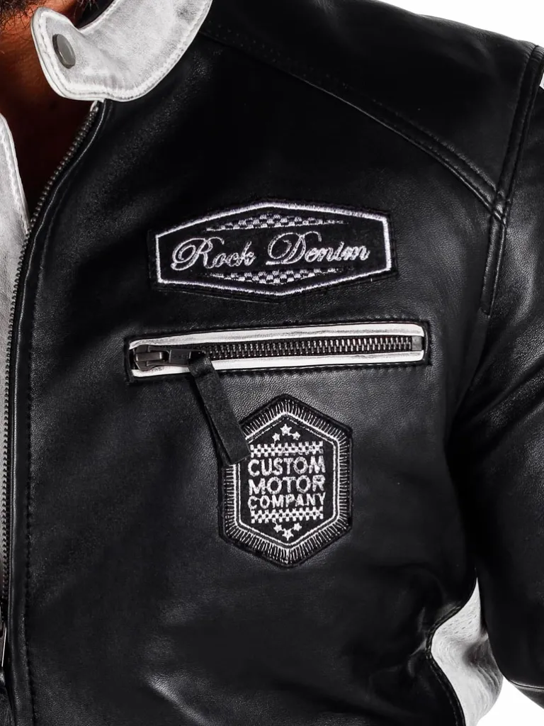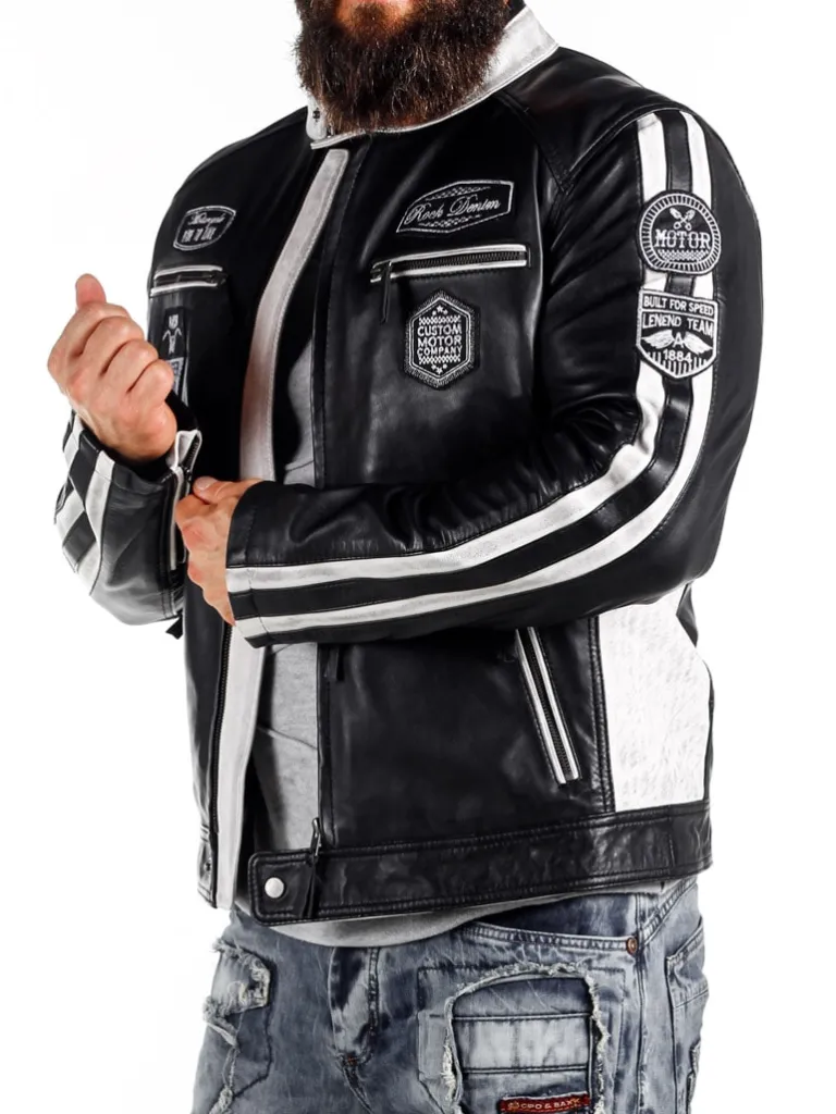 Sort Og Hvid Jakke I Læder Frabehagelig Skindjakke I Et Cool Design Med Lapper Og Hvide Striber. Den Lukkes Ved Hjælp …