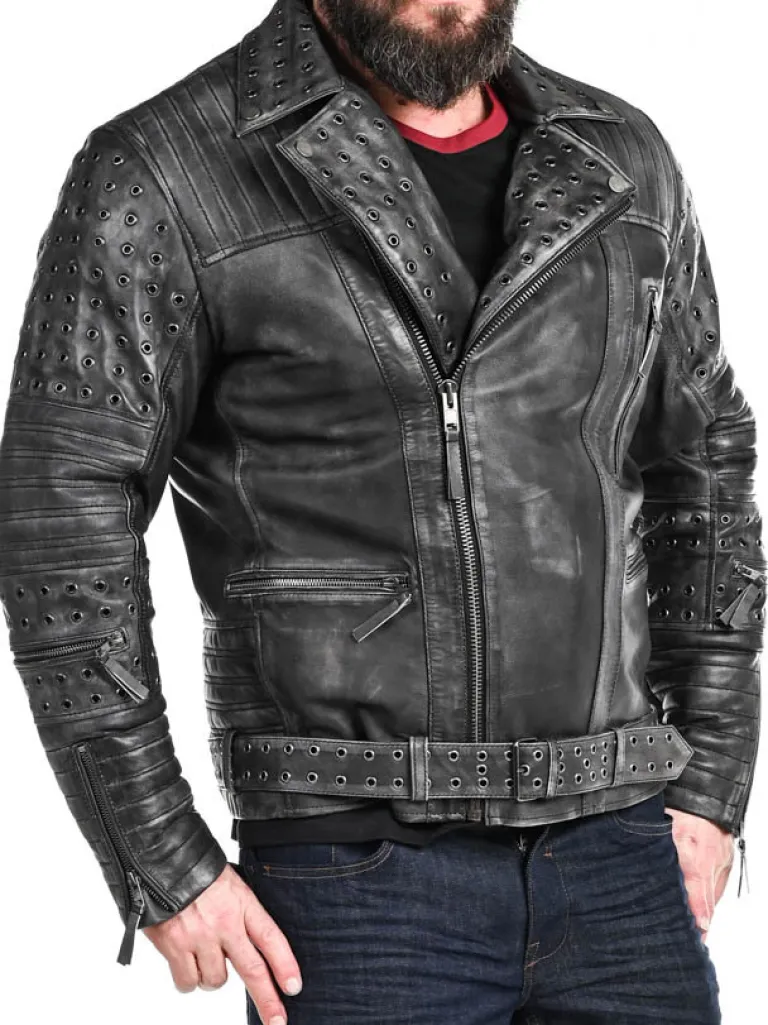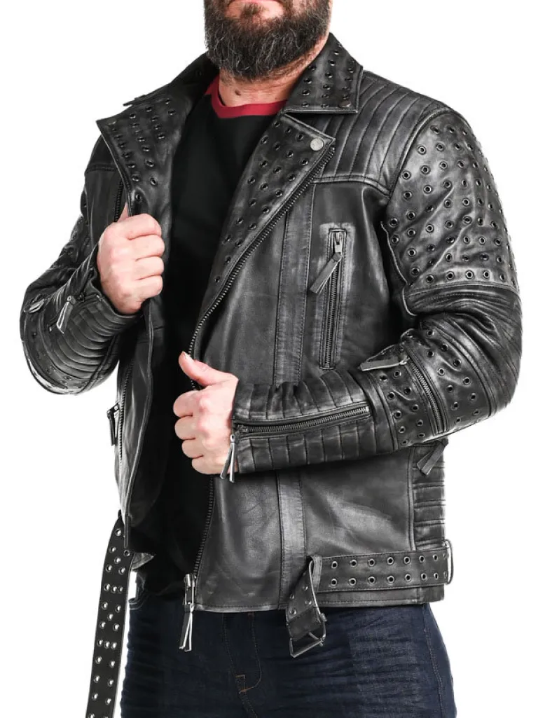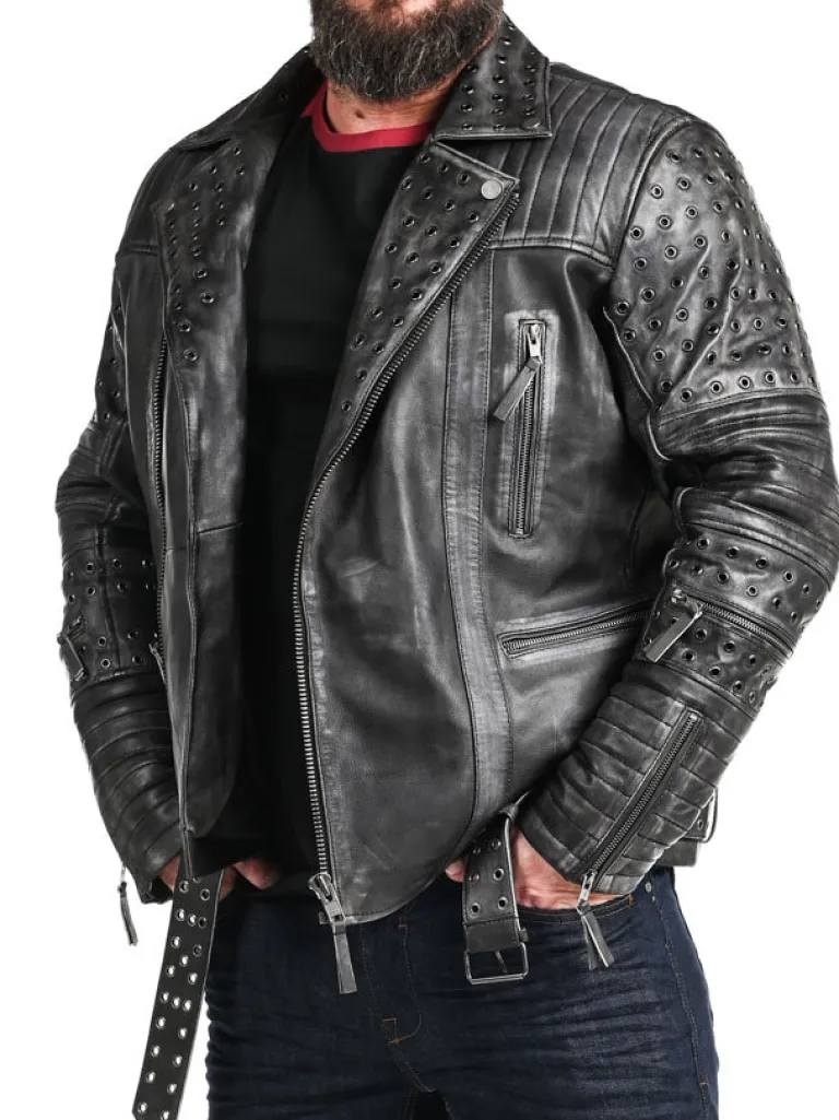 Læderjakke Med Nitter Framørkegrå Jakke I Kvalitetslæder Med Hulnitter, Der Giver Et Hårdere Look. Den Er Designet …