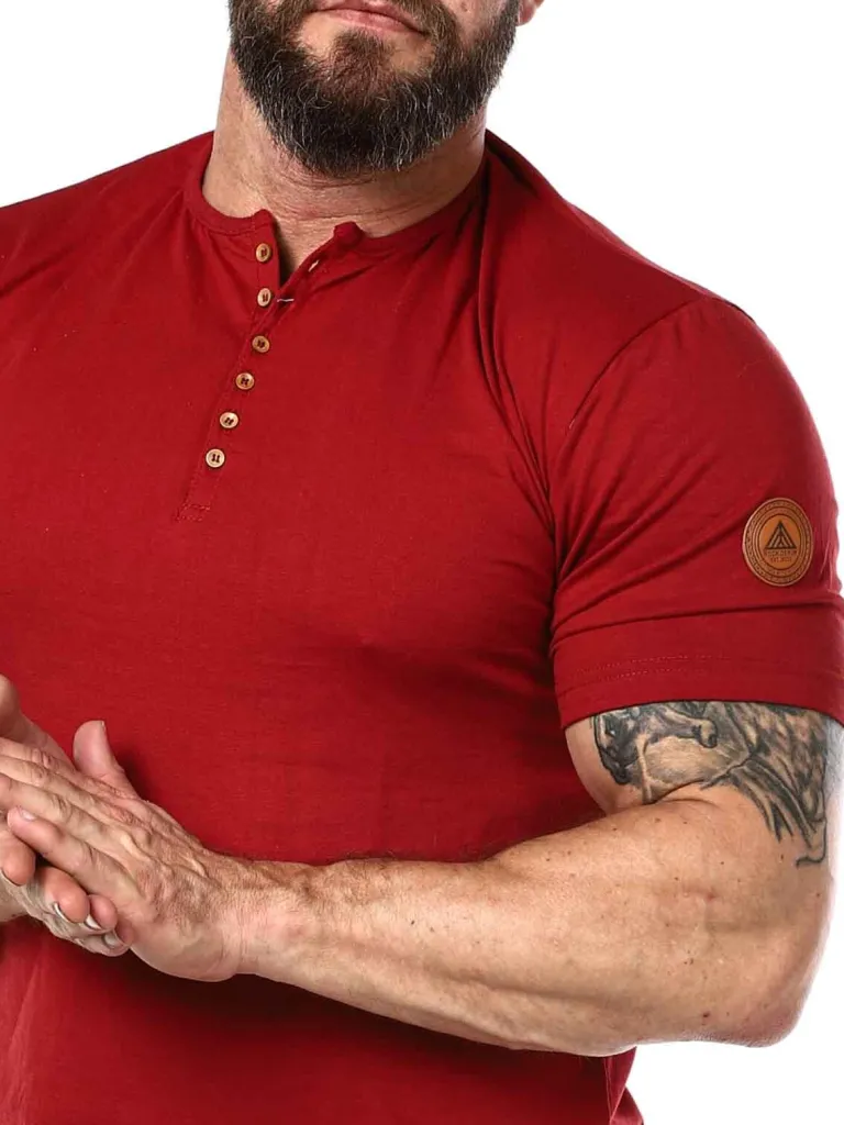 T-Shirt Med Knapper Fra her Har Vi Fremstillet Vores Egen T-Shirt I 100 % Bomuld. Den Har En Klassisk Pasform, Og Er Designet Med En Knapåbning Fortil. En Lap, Der Kommer I En Imitation Af Læder, Ses På Venstre Ærme.