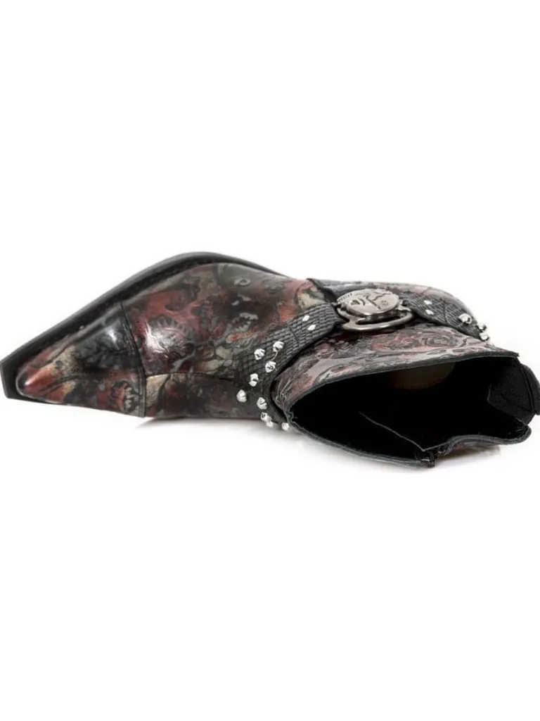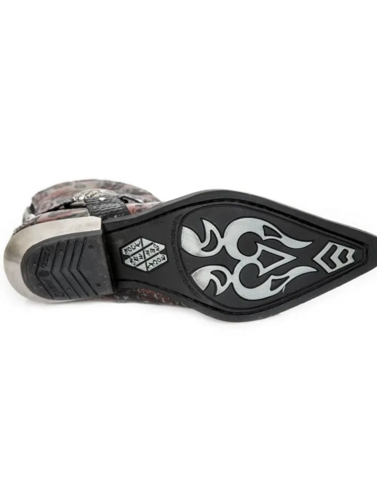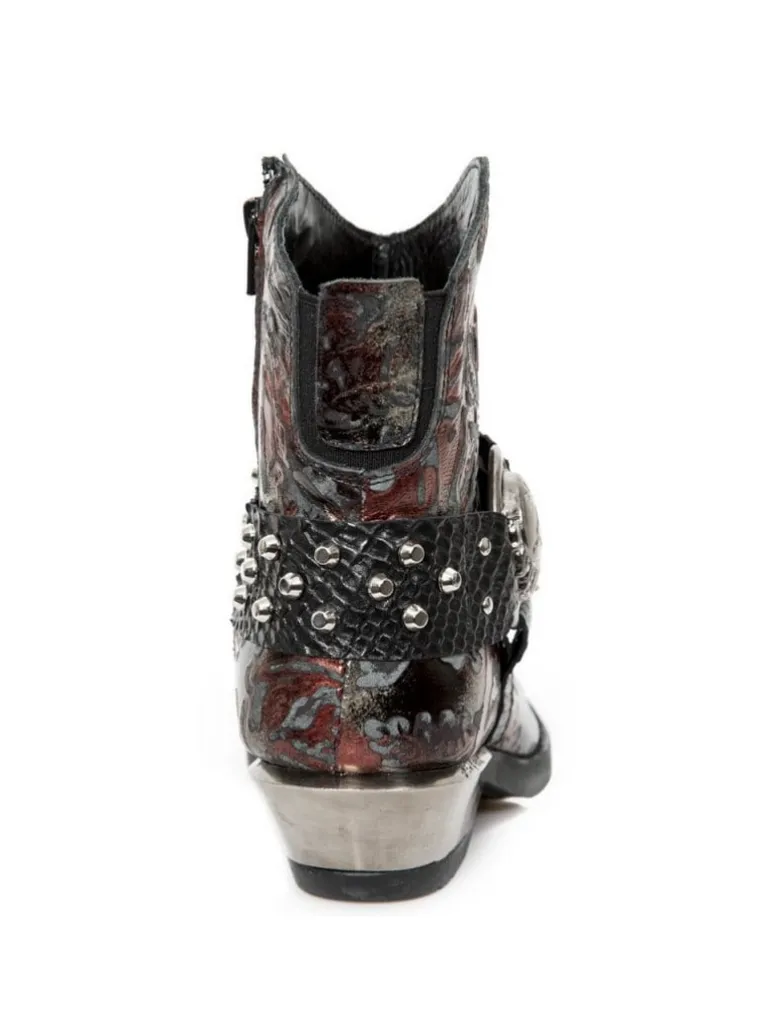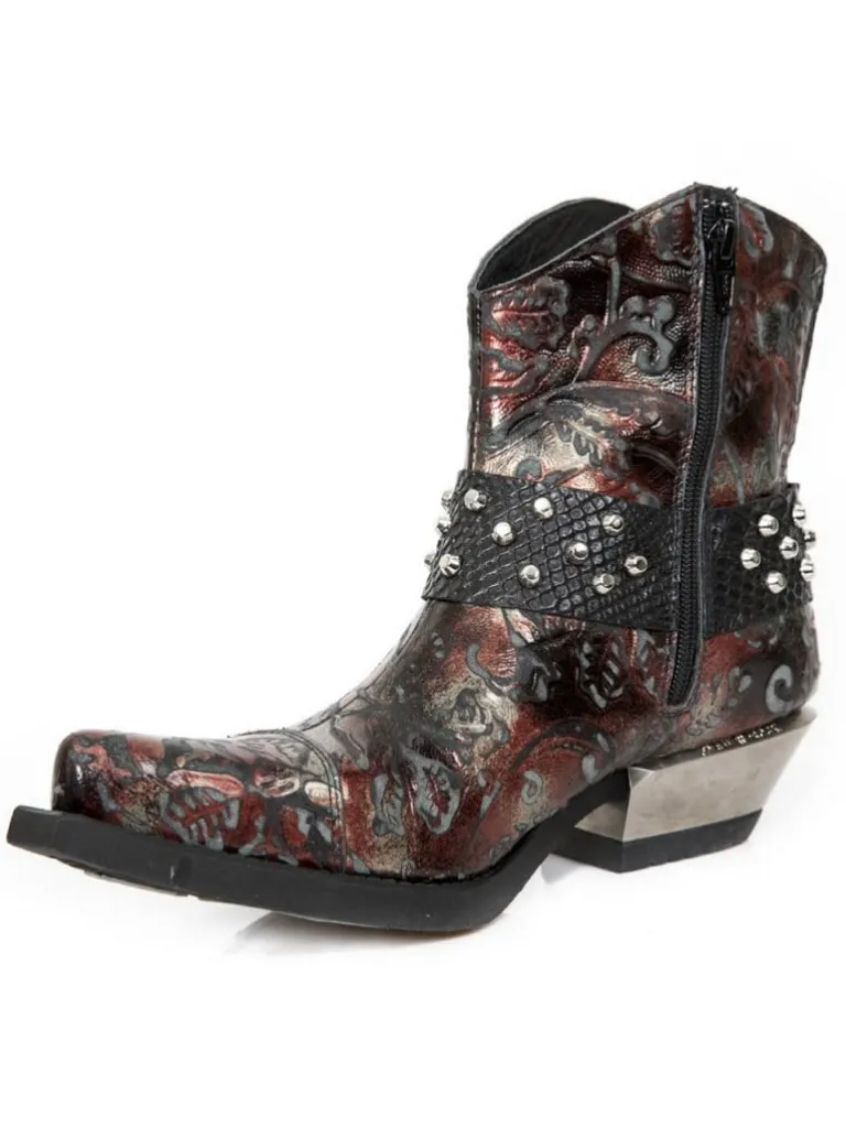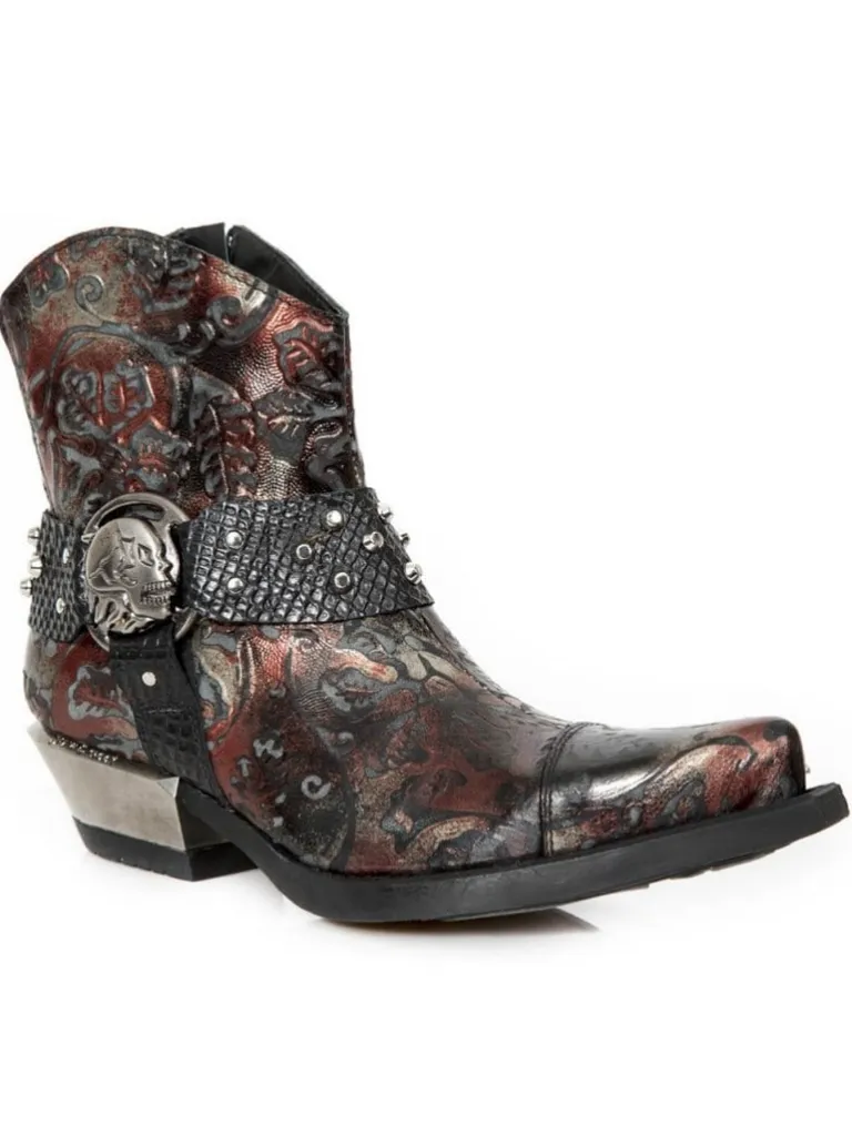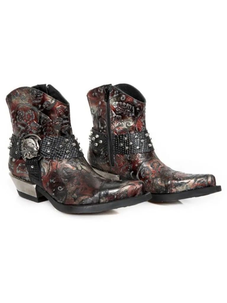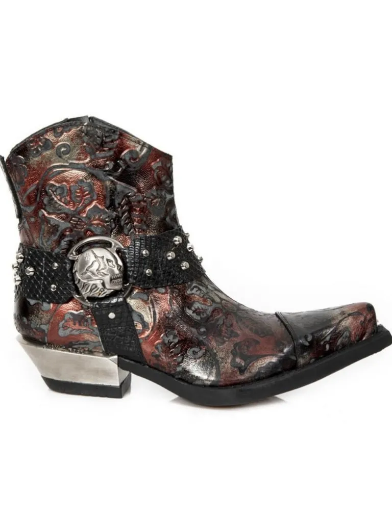 Grove Støvler Fra New Rocksolide Støvler I Ægte Læder Med Et Noget Højere Skaft, En Lav Hæl Og En Spids Tå. Metalspænde Med Dødningehoved Rundt Om Anklen Og Et Rødt Mønster I Læderet. Hælen Har Et Metallisk Dække, Som Forhøjet Det Hårde Design.