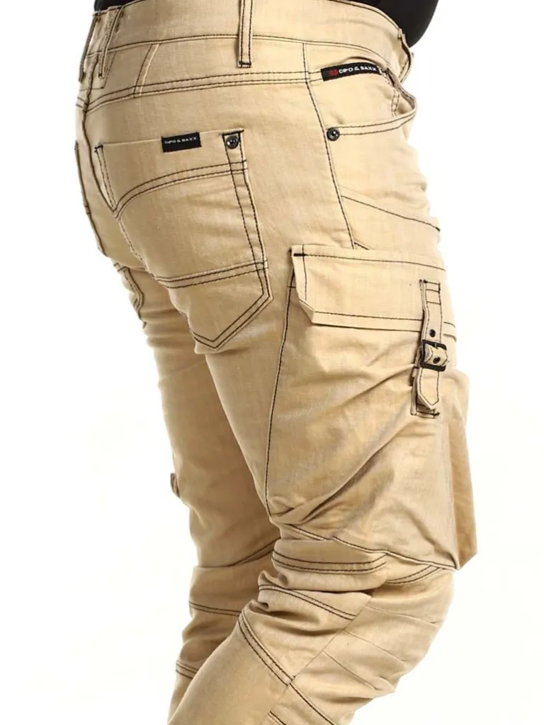 Jeans Med Cargolommer Fra Cipo &Amp; Baxxproduceret I En Fin Bomuld Med En Normal Pasform Og Ben Der Bliver Noget Smallere Ned Mod Anklerne. Disse Bukser Har Sorte Sømme Og Cargolommer Som Er Fremhævet.