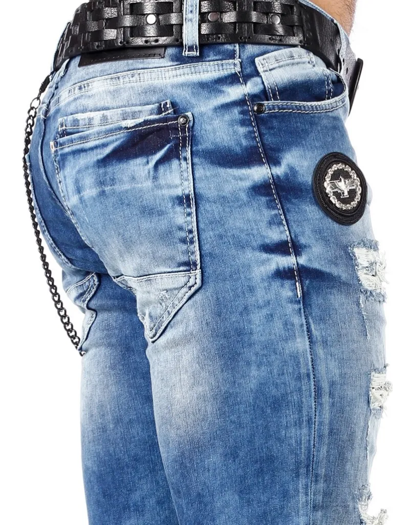 Rå Jeans I En Slim Model Fra Cipo &Amp; Baxxbukser I En Blød Denim Med Aftagelig Kæde Og Rummelige Lommer. Hårdt Design Med Slitager, Revner, Kontraststof Og Lapper Af Stof.