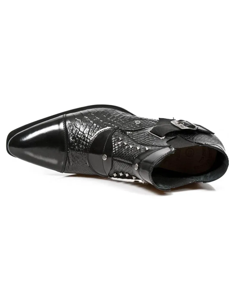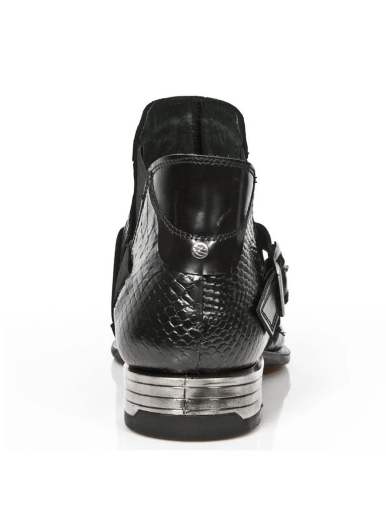 Lave Støvler Fra New Rocksorte Sko I Ægte Læder Med Mønster Og Lavt Skaft. Detaljerede Med Nitter Og Stropper I Elas…