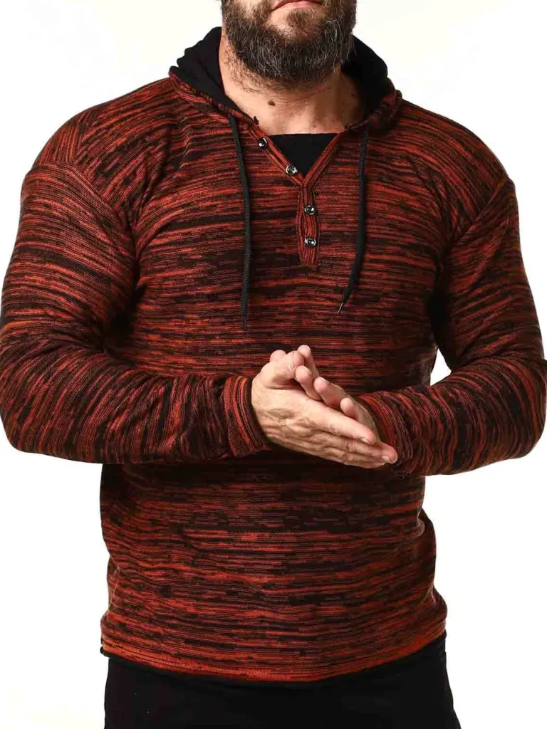 Finstrikket Hættetrøje Fra Carismaorange Trøje Med Sorte Detaljer. Den Har Knapper Fortil, Ved Halsens Åbning, Og He…