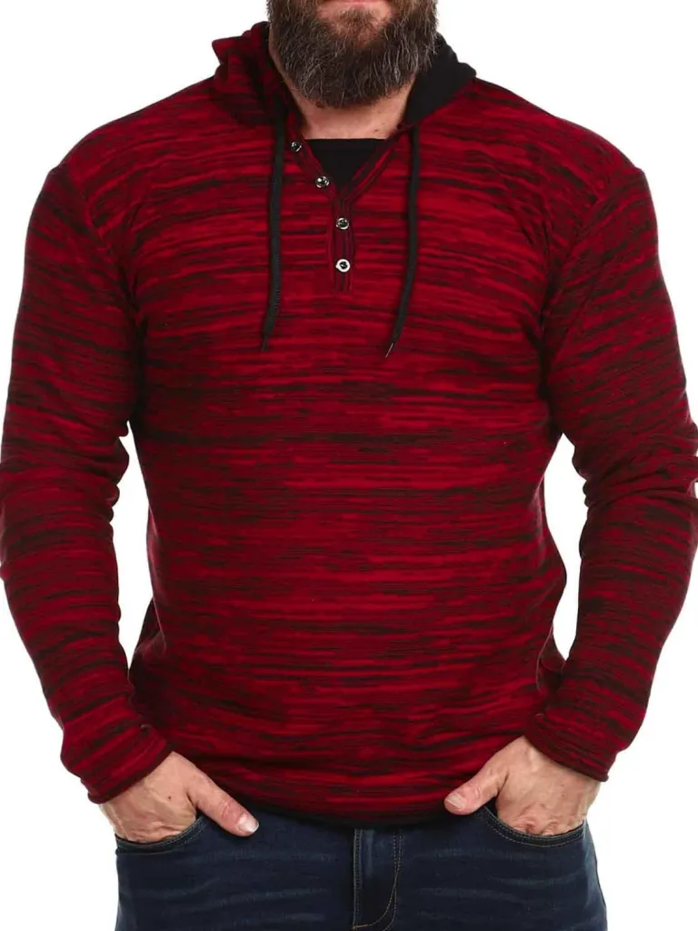 Finstrikket Hættetrøje Fra Carismarød Trøje Med Sorte Detaljer. Den Har Knapper Fortil, Ved Halsens Åbning, Og Hert…