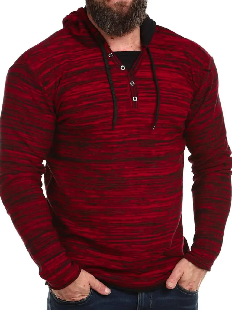 Finstrikket Hættetrøje Fra Carismarød Trøje Med Sorte Detaljer. Den Har Knapper Fortil, Ved Halsens Åbning, Og Hertil Kommer Snøring I Hætten. Den Er Fremstillet I Et Tyndt Og Behageligt Materiale.