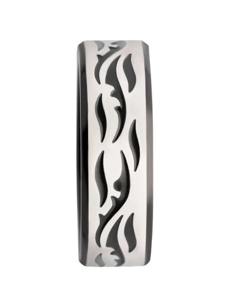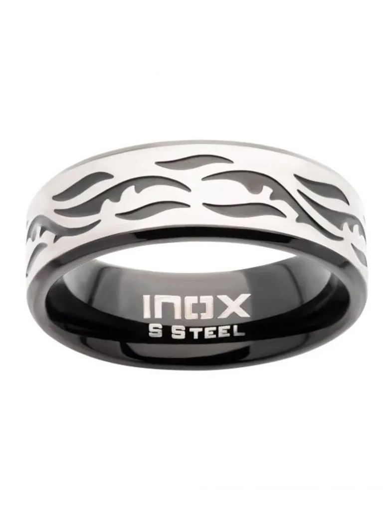 Sort Og Sølvskinnende Ring Med Et Tribal Mønster. Den Er Fremstillet I Rustfrit Stål Og Titan.