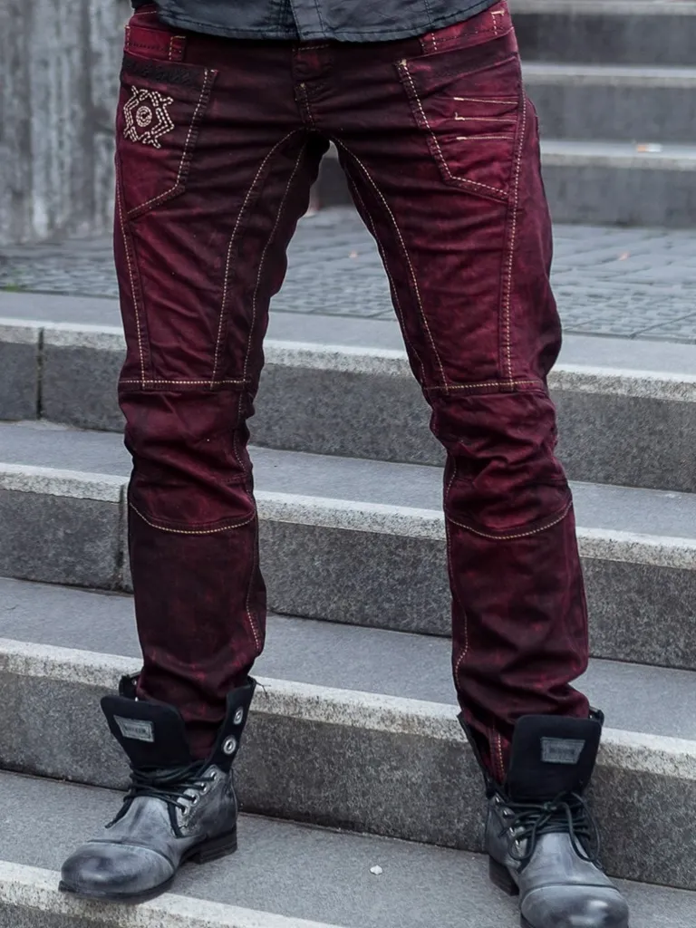 Mørkerøde Jeans Fra Fra Cipo &Amp; Baxxbukserne Har Et Forvasket Look Som Fremhæves Af Sømme Og Et Skræddersyet Mønster I Beige, Gråt, Sort Og Rødt. I Linningen Bagtil Sidder En Sort Lap Med Røde Detaljer I Metal. Modellen Har En Smallere Pasform Og Masser Af Lommer.