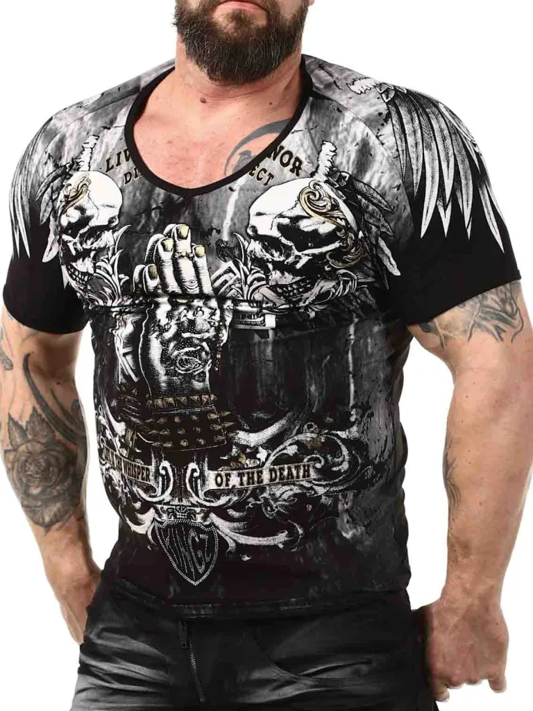 Mønstret T-Shirt Fra Kingzsort T-Shirt Med En V-Udskæring I Halsen. Den Er Fremstillet I Et Behageligt Bomuldsmateriale, Hvor Der Er Noget Stræk I. Fortil Og Bagpå Pryder Et Cool Tryk I Hvid, Grå Og Guld T-Shirten. Rhinstene Forhøjer Effekten Af Mønstret På Flere Steder.