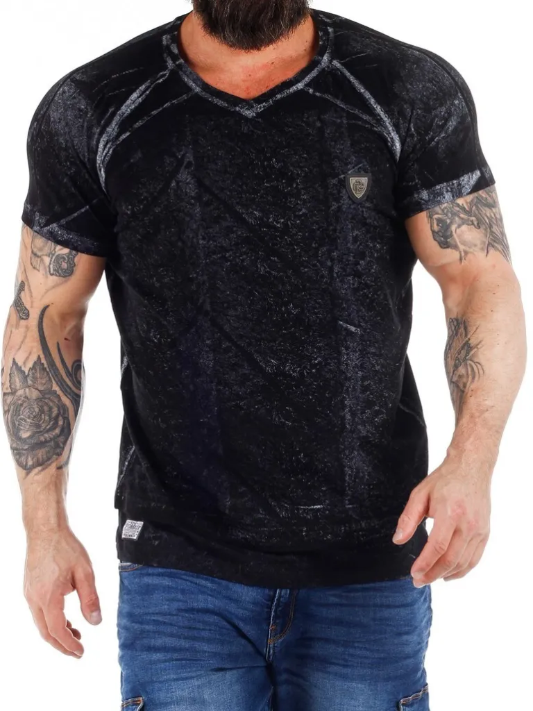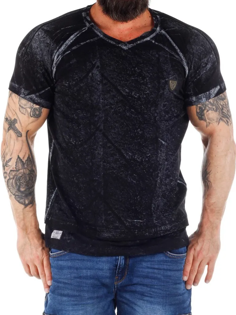 Sort T-Shirt Fra Cipo &Amp; Baxxsort T-Shirt Med Stræk I Og Hvide Motiver Og Nuancer. På Venstre Side Af Brystet Er Der En Lille Sort Lap I Imiteret Skind, Med En Mindre Metalpatch Henover. Den Har V-Udskæring, Og Føles Behagelig Og Blød Modoppen. Den Passer Til Både Shorts Og Jeans!