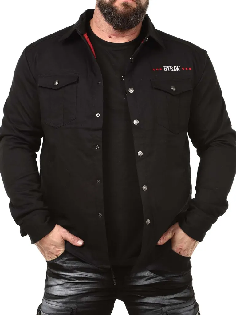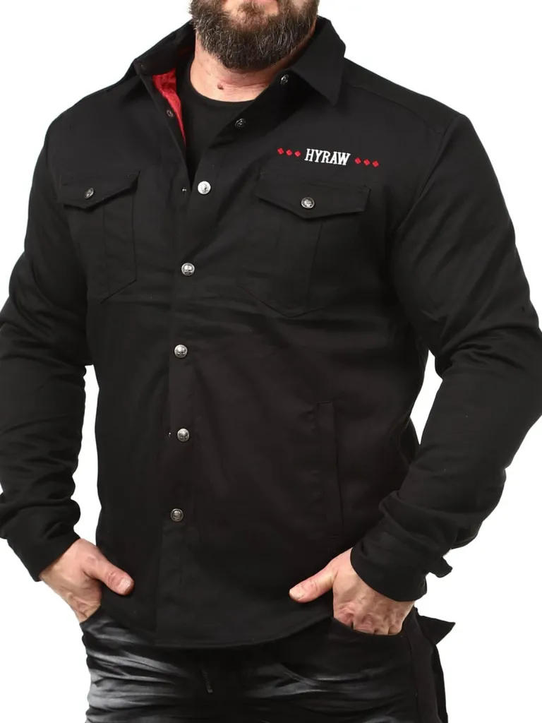 Jakke Fra Hyrawblød Og Behagelig Jakke Med Et Rødt Inderstof. Jakken Er Designet Med Et Tryk I Kontrastfarver På Både For- Og Bagsiden. Den Har Enave, To Lommer På Brystet Der Begge Kan Lukkes Og To Åbne Lommer På Maven. Den Lukkes Ved Hjælp Af Knapper I Metal.