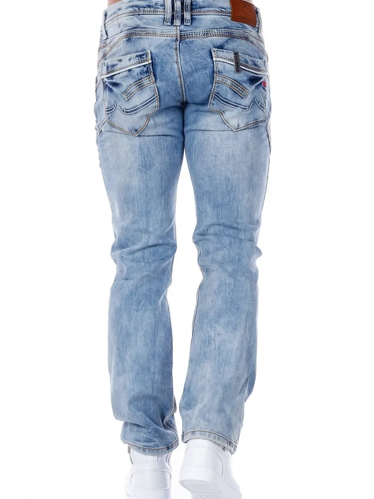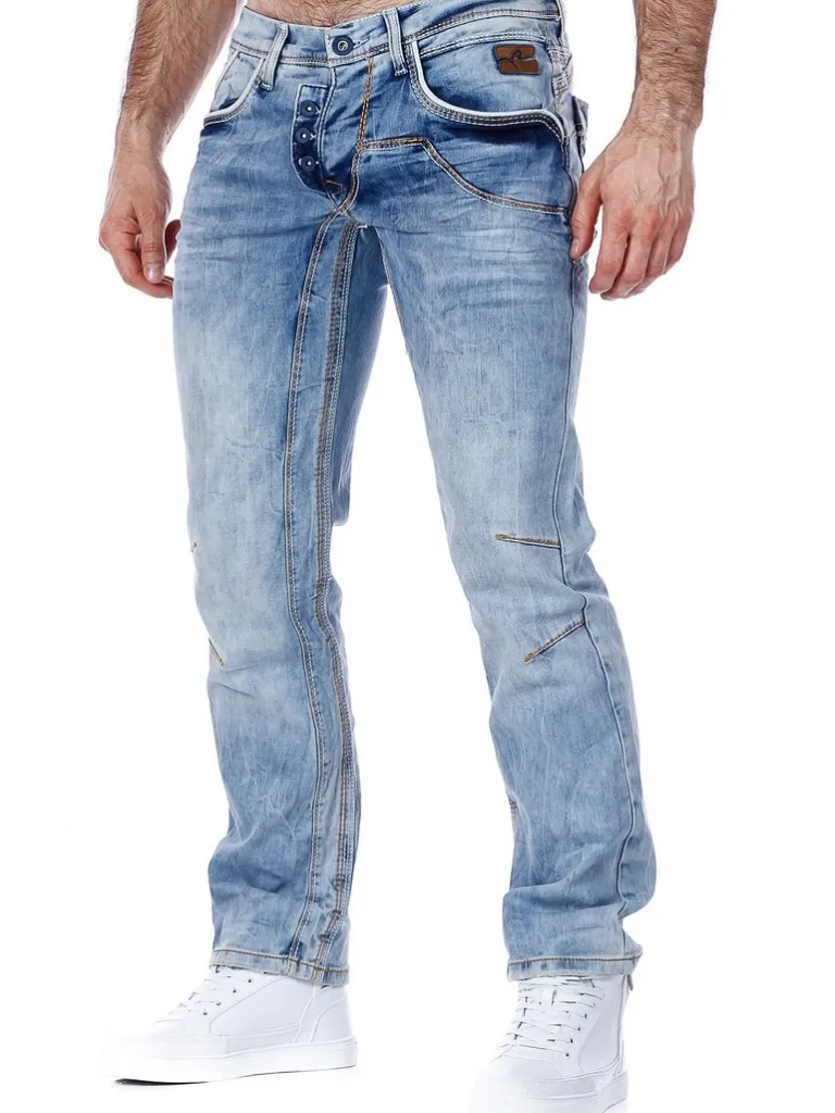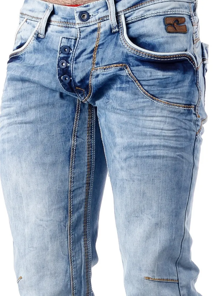 Lyseblå Jeans Med Markerede Sømme Fra Rusty Nealbukser I Et Bekvemt Denimmateriale, Som Der Er Noget Stretchigt. En Lys Vask, Som Fremhæves Med Grove Sømme I Gult Og Hvidt. Fire Lommer Fortil Og To Bagpå.