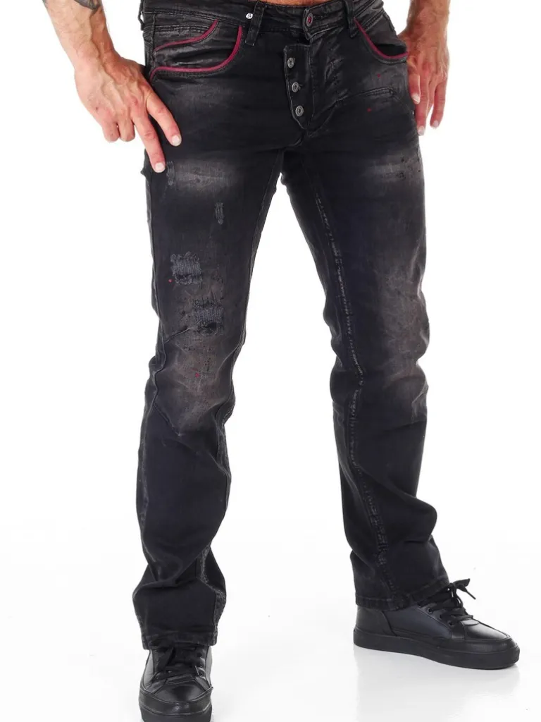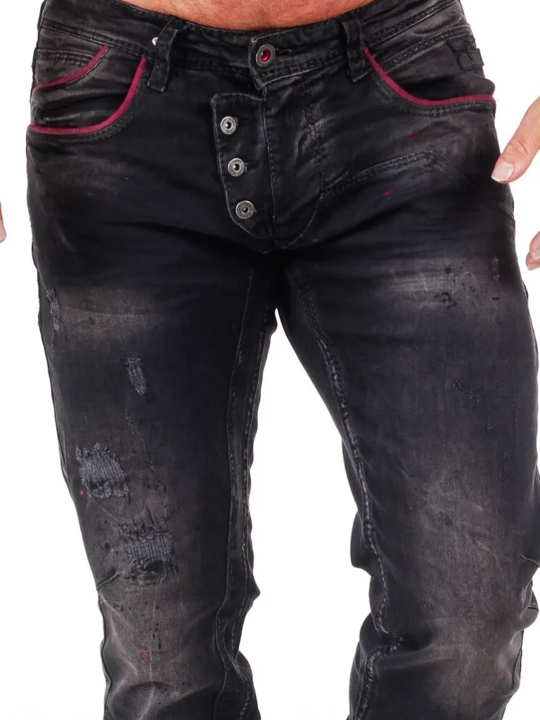 Jeans I Sort Med Markede Sømme Fra Rusty Nealbukser Med Slitager Og Lyse Partier I Et Behageligt Denimmateriale, Hvor Der Er Nkget Stræk I. Disse Bukser Kommer I En Model Med 5 Lommer, Og Der Findes Hertil En Gylp Med Synlige Knapper, Farvestænk Og Grove Sømme I Gråt For At Give Bukkserne Et Unikt Design.