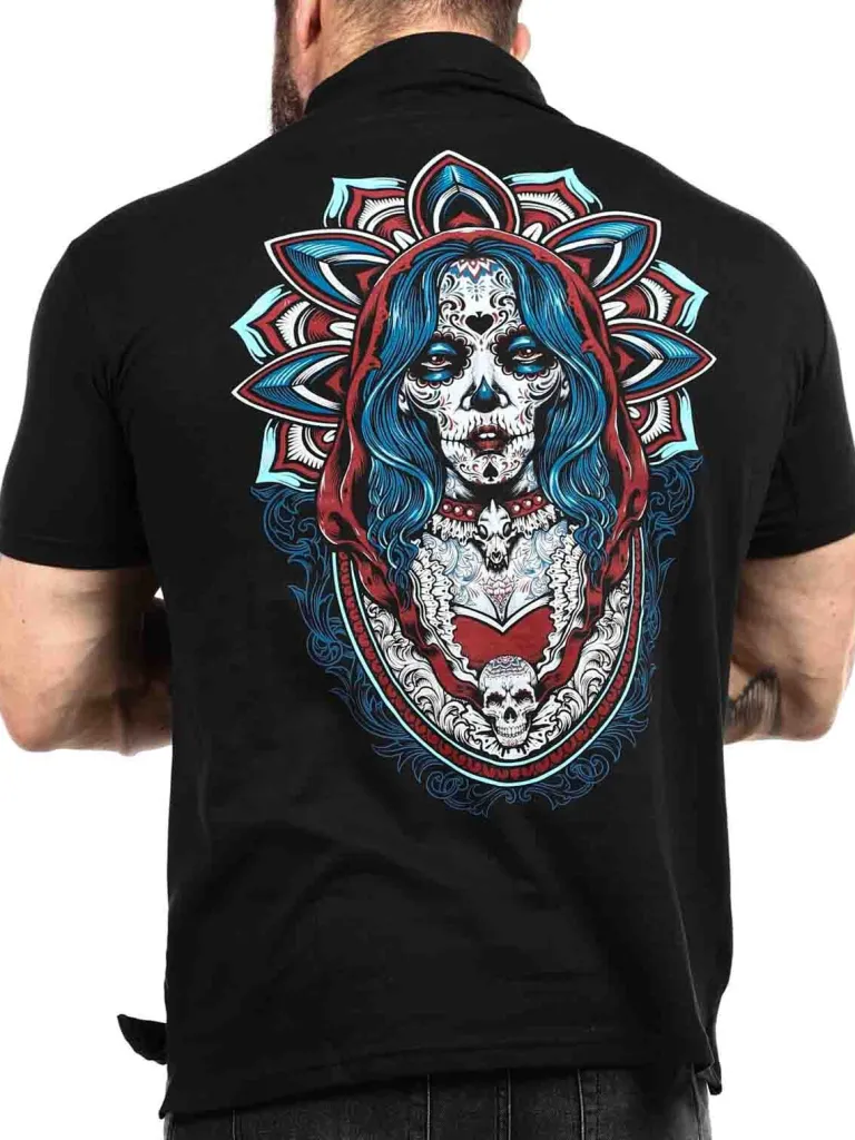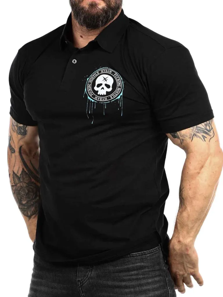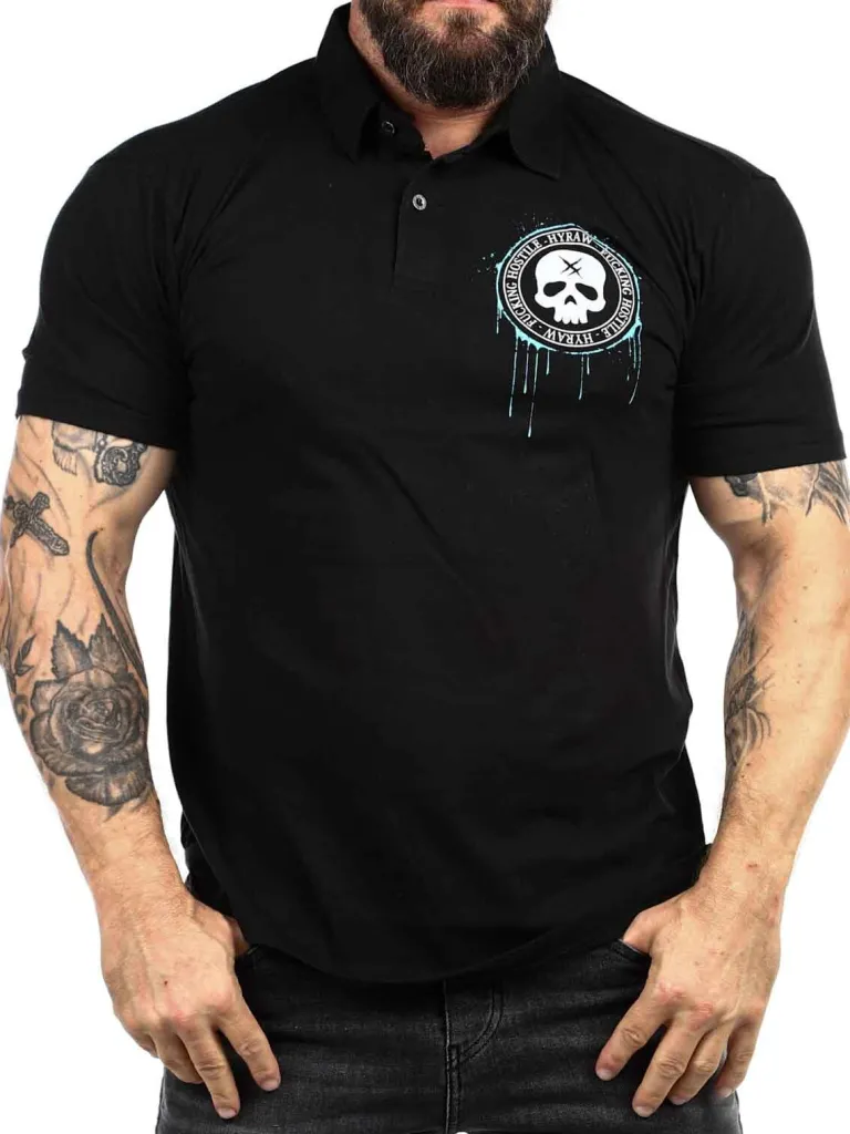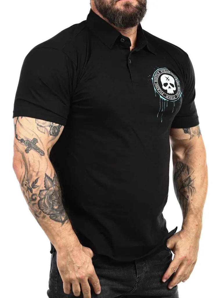 Polo Fra Hyrawhård T-Shirt Med Enave Og Knapper. Den Er Designet Med Et Logo Og Et Motiv Bestående Af Et Dødningehoved. Dette Er En Elastisk Model Med En Klassisk Pasform.