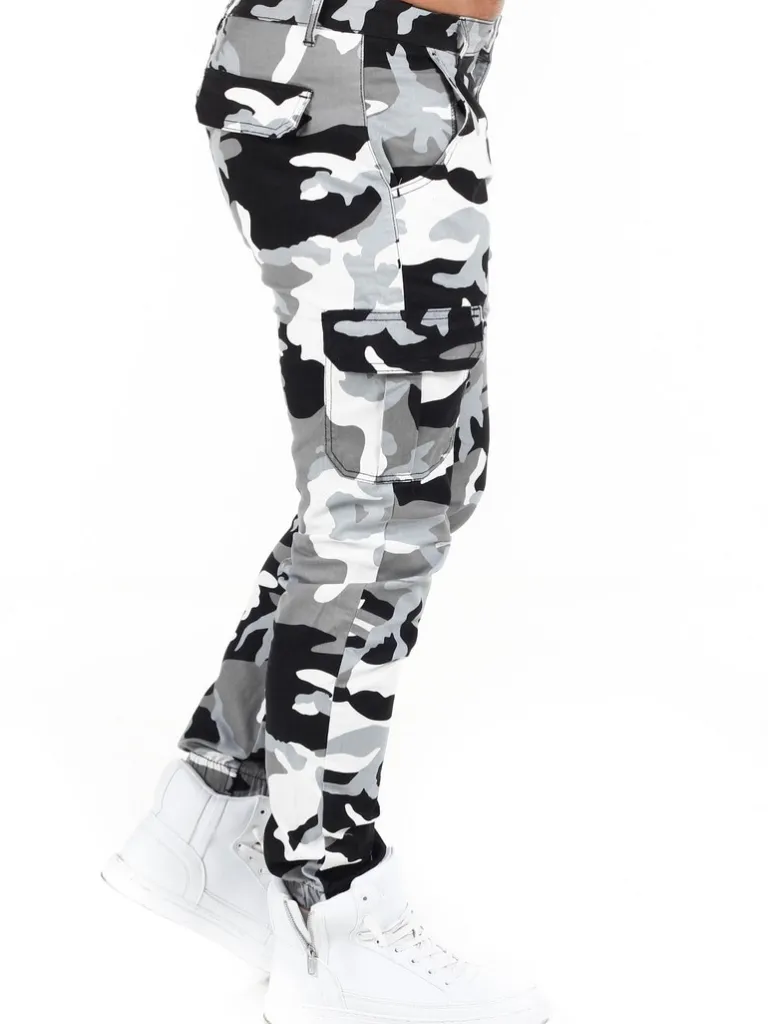 Byxor I Camo Från Urban Classicsmönstrade Byxor I Svart, Vitt Och Grått Med Cargofickor. Bekvämt Material Med Lite Stretch, I En Modell Med Avsmalnande Ben Och Resår Vid Benslut.