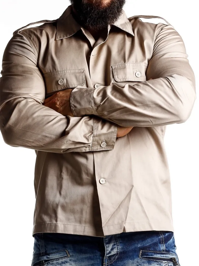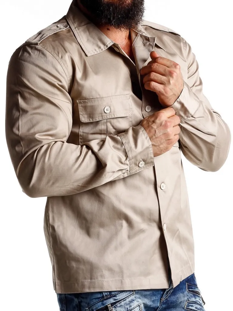Skjorte I Etaftigere Materiale Fra Branditdesign Inspireret Af Hæren Tøj, Med Remme På Skuldrene Og To Store Brystlom…