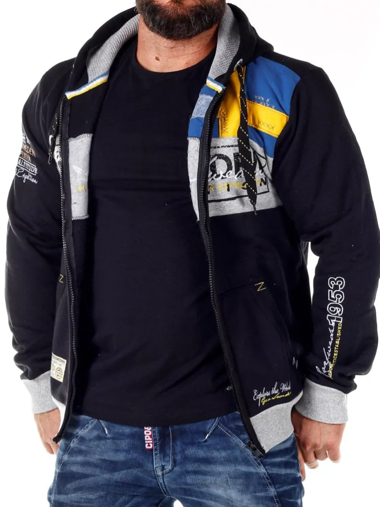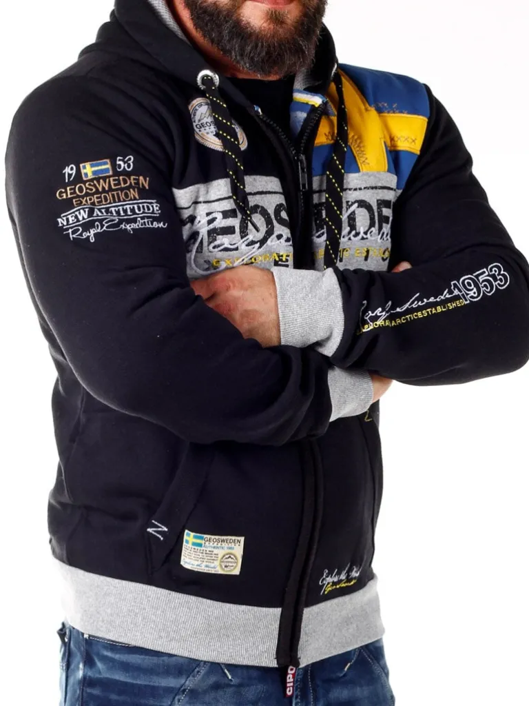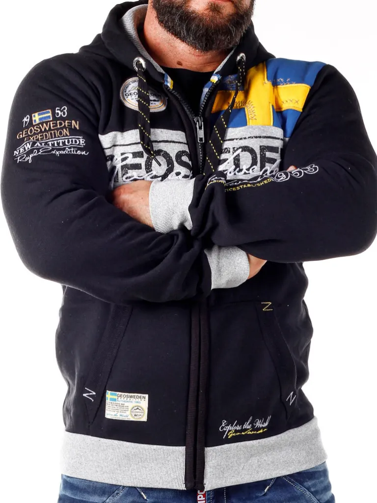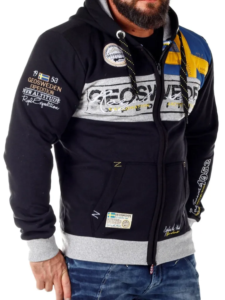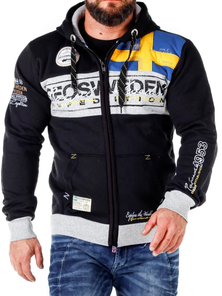 Sort Ziphoodie Fra Geo Swedentrøjen Har En Rummelig Hætte, Lynlås Som Går Hele Vejen Ned Og Store Lommmer På Maven. Mærkets Logo Og Mønster Ses Både Fortil Og Bagpå, Og Den Har En Grå Ribkant Forneden Og Ved Ærmernes Slutning.