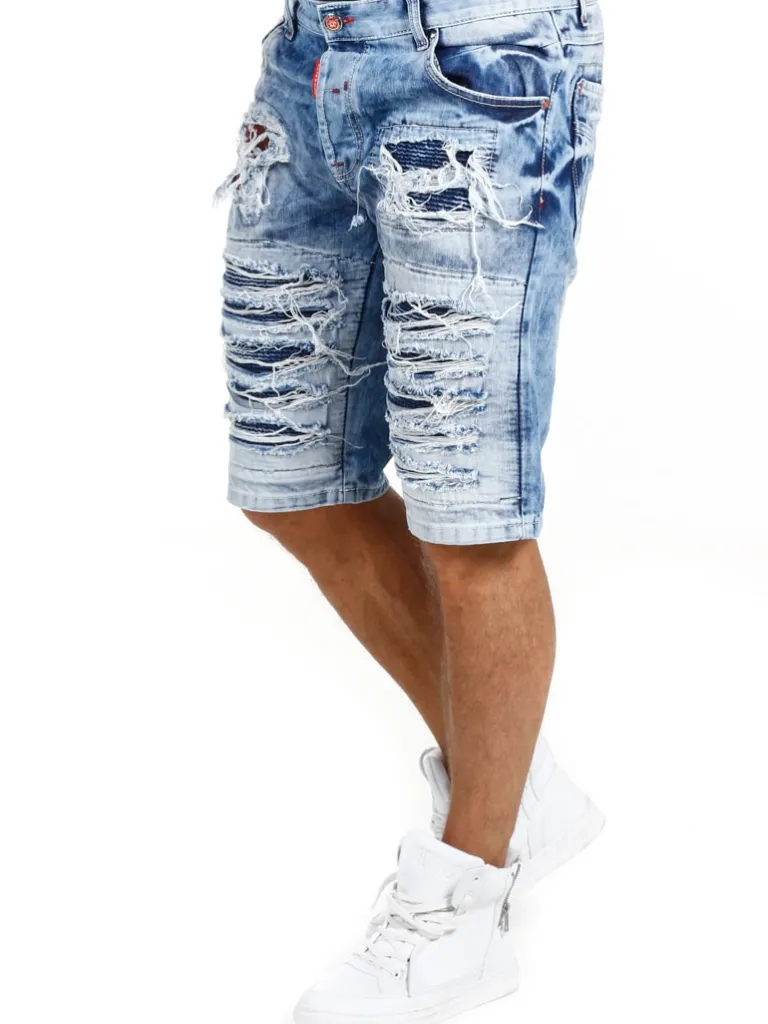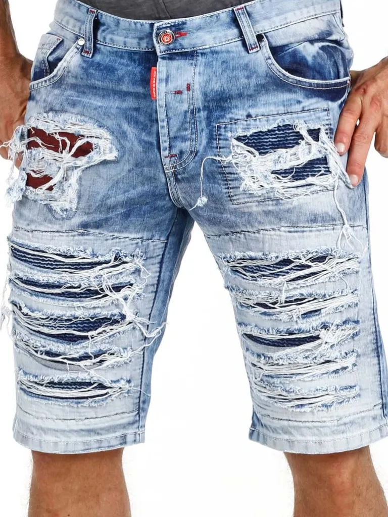 Rippede Shorts Fra Cipo &Amp; Baxxflotte Shorts I En Stenvasket Denim Med Grove Slitager Og Detaljer I Rød. De Har En Klassisk Pasform Med Tre Forlommer Og To Baglommr. Bukserne Er Fremstillede Af En 100 % Kvalitetsbomuld.