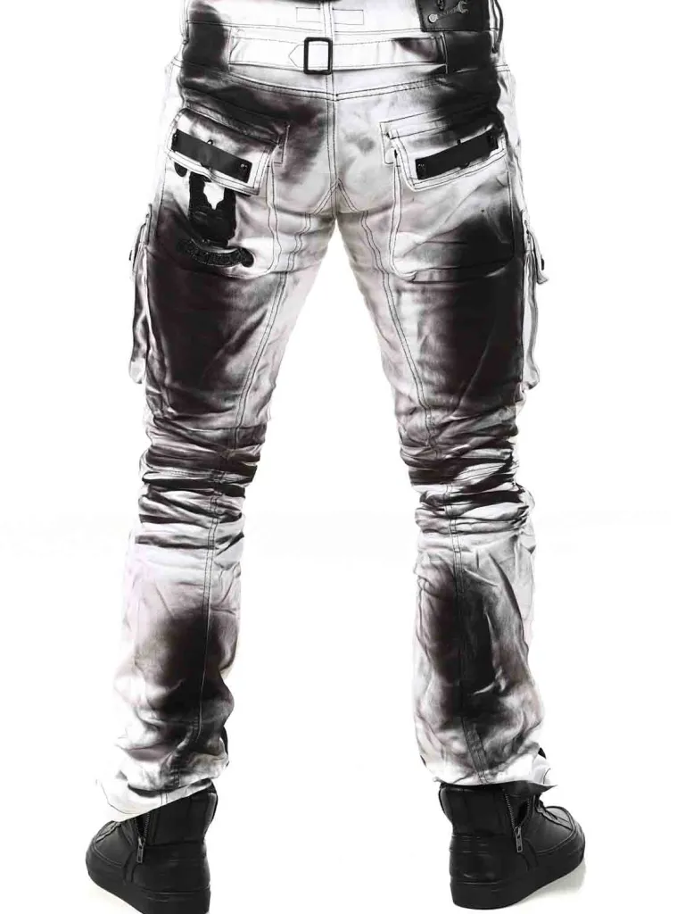 Hårde Rock Jeans Fra Kingzunikke Jeans Med Flere Lommer Og Malede Effeker. De Er Cool Detaljerede Med Nitter Formet Som Dødningehoveder, Remme I Læder Og Lynlåse På Knæene. Disse Jeans Lukkes Ved Hjælp Af En Lynlås I Gylpen, Og Desuden Har De Remme, I Taljen, Til Bæltet.