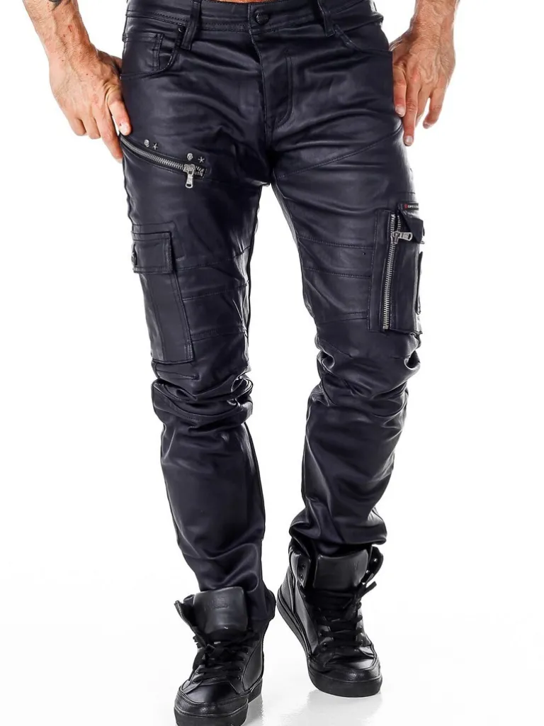 Hårde Jeans Fra Cipo &Amp; Baxxbukser I En Sort Bomuldsblanding Med En Olieskinnende Overflade, Skindimitation Og Grove Lynlåse. Modellen Har En Normal Pasform I Taljen, Slanke Ben Og Godt Med Lommer. Cool Jeans I Et Maskulint Design!