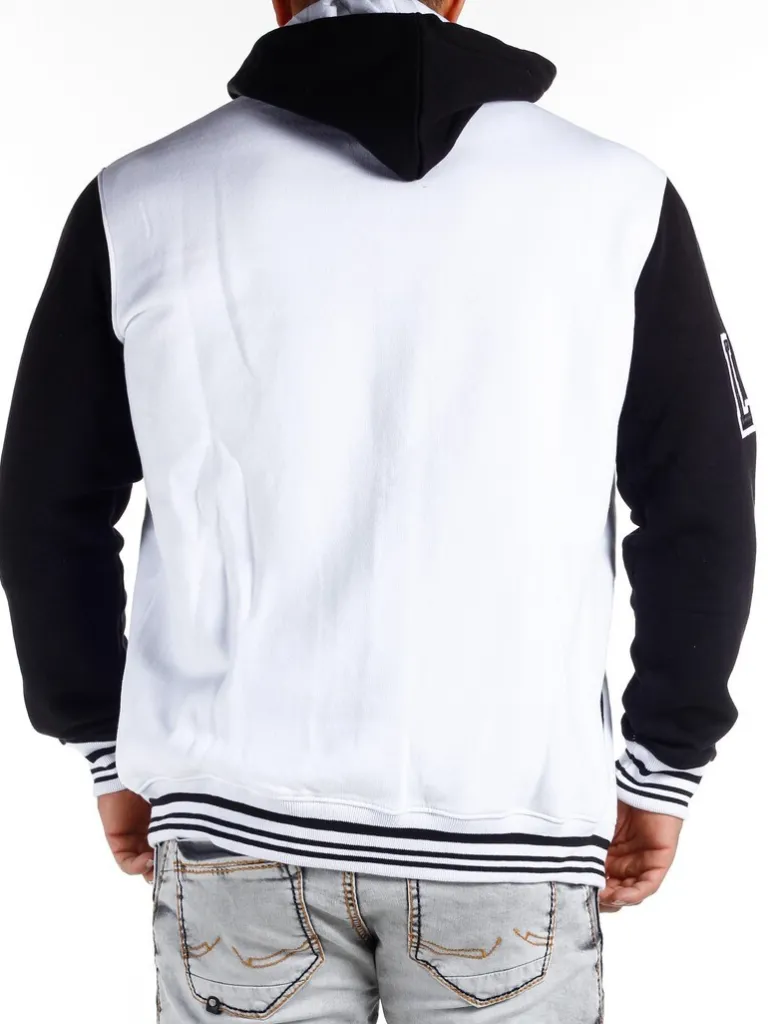 Old School Hoodie Fra Rusty Nealhvid Og Sort Trøje Som Lukkes Med Sorte Knapper, Og Som Har En Hætte, Der Kan Tages Af. To Rummelige Lommer Findes På Maven. Skræddersyede Detaljer Og Striber Forhøjet Designet.