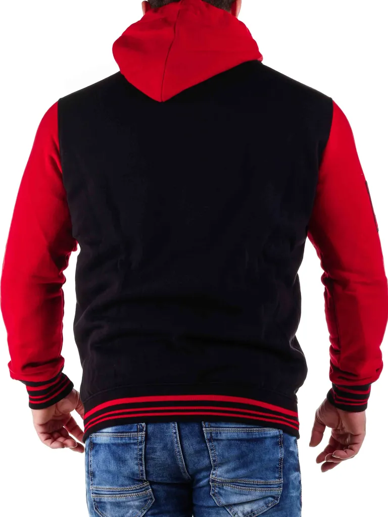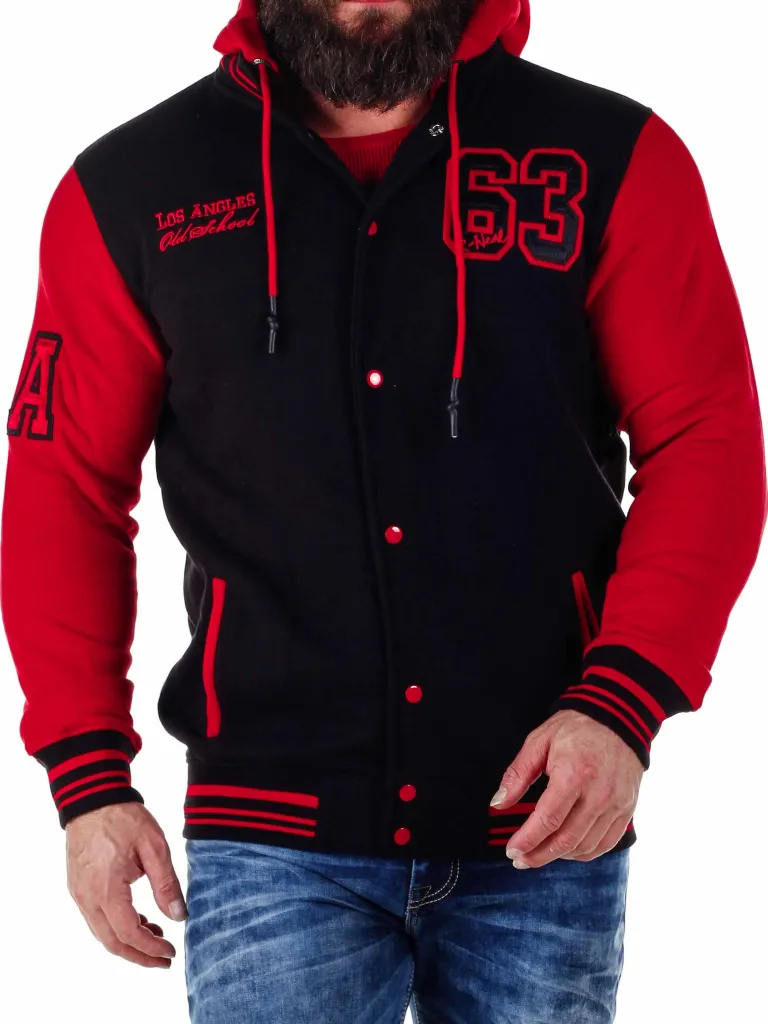 Old School Hoodie Fra Rusty Nealsort Og Rød Trøje Som Lukkes Med Røde Knapper, Og Som Har En Hætte, Der Kan Tages Af. To Rummelige Lommer Findes På Maven. Skræddersyede Detaljer Og Striber Forhøjet Designet.