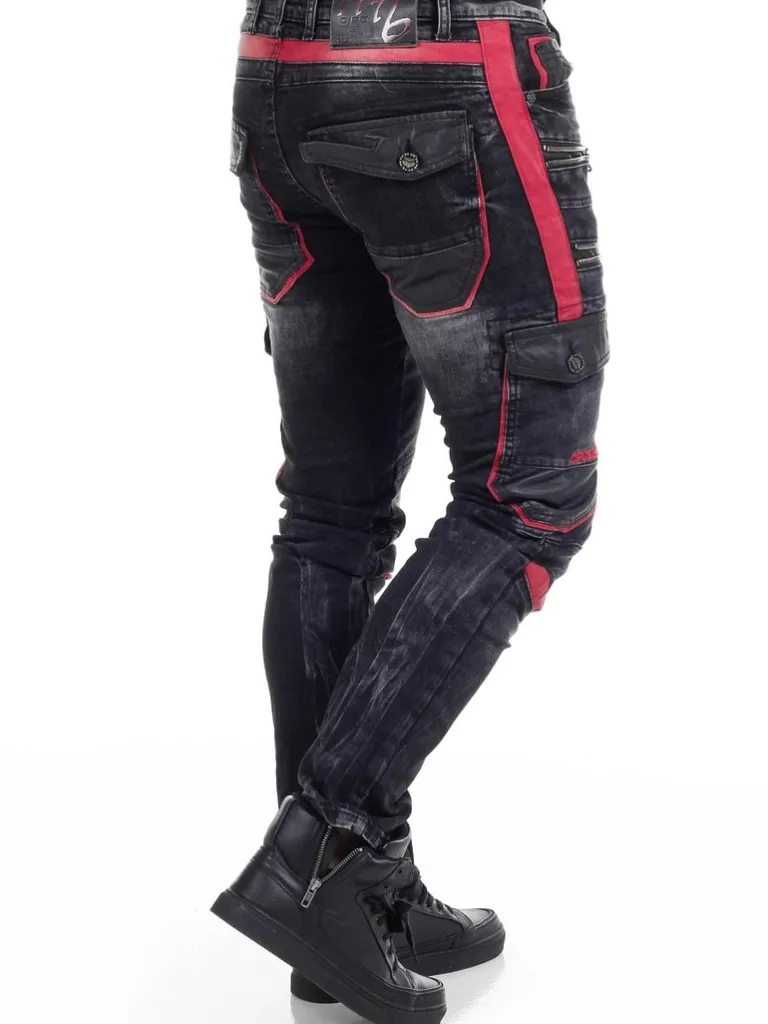 Hårde Jeans Fra Cipo &Amp; Baxxsorte, Smalle Jeans Med Rå Detaljer Og Flotte Slitager. Materialet Føles Stretchigt, Og Modellen Har Fire Lommer Fortil Og To Bagpå. Bukserne Har Et Unikt Design Med Røde Kontraster, Lynlåse Og Sorte Læderimitationer.