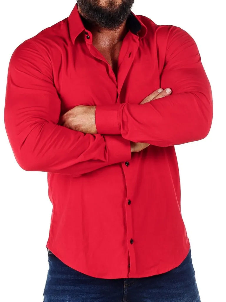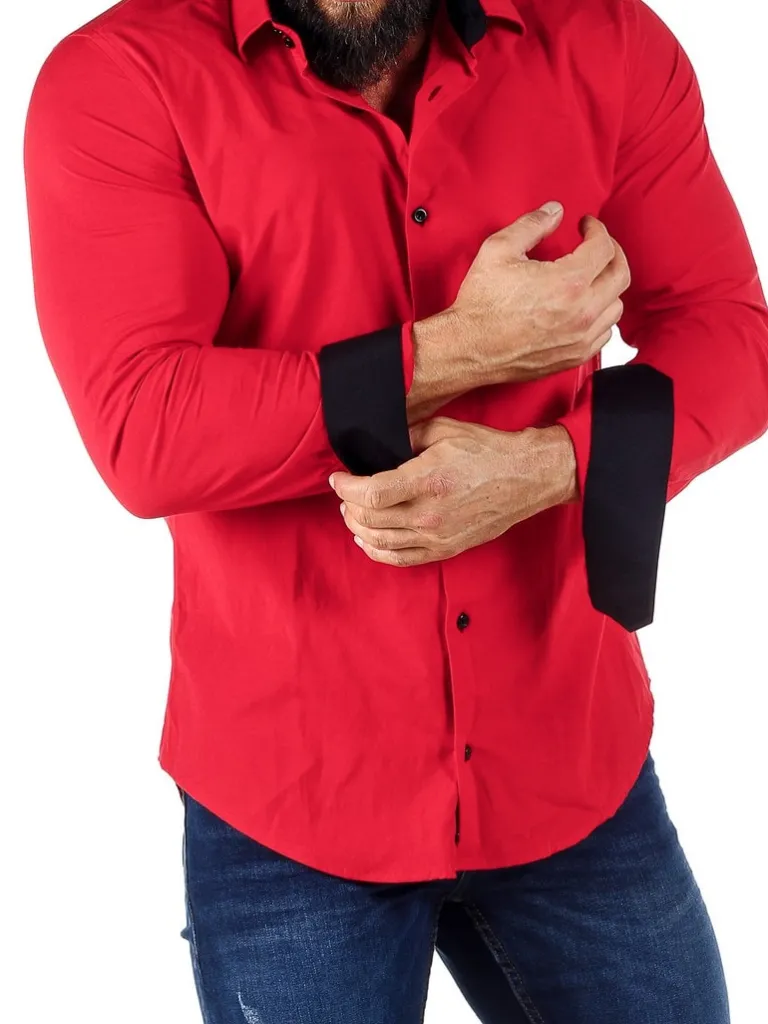 Rød Skjorte I En Slim Fit-Model Fra Rusty Nealbomuldsskjorte I En Bekvem Model, Som Er Noget Stretchig. Rød Base Med Knapper, Indvendigave Og Enderne Af Ærmerne I En Kontrastfarve. En Smallere Model Med Afrundet Linning Forneden Og Med Forstærketave, Som Holder Formen.