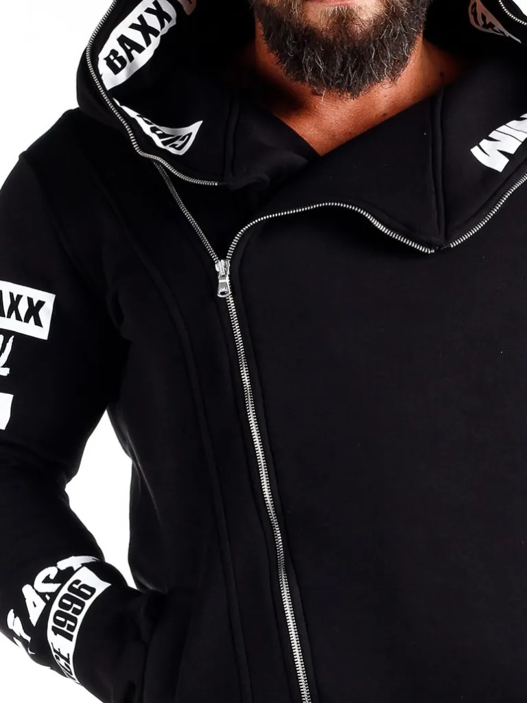 Sort Hættetrøje Med Hvidt Trykblød Hættetrøje Med Skrå Lynlås. Hvidt Tryk På Ærmerne Og På Indersiden Af Hætt…