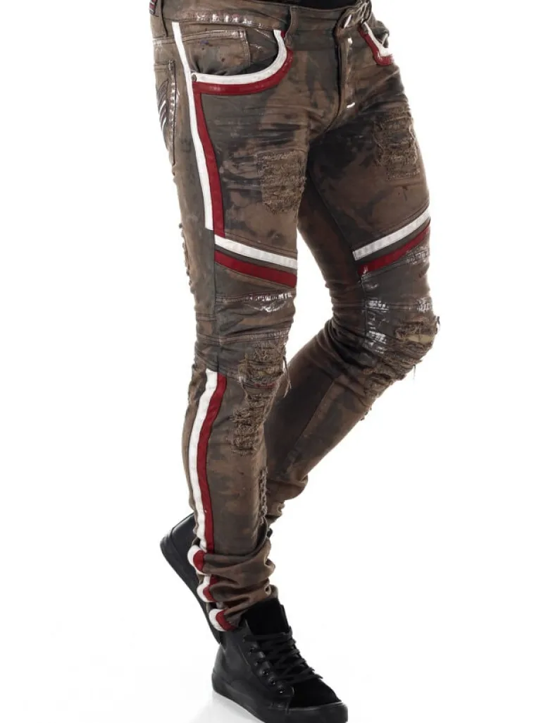 Jeans Fra Kingzbukser I Et Bekvemt Denimmateriale Med Røde Og Hvide Detaljer I En Skindimitation Og Klatter Af Maling I Blå, Hvid Og Rød. En Slank Model Med Tre Lommer Fortil Og To Bagpå.