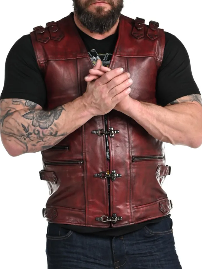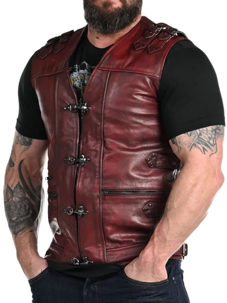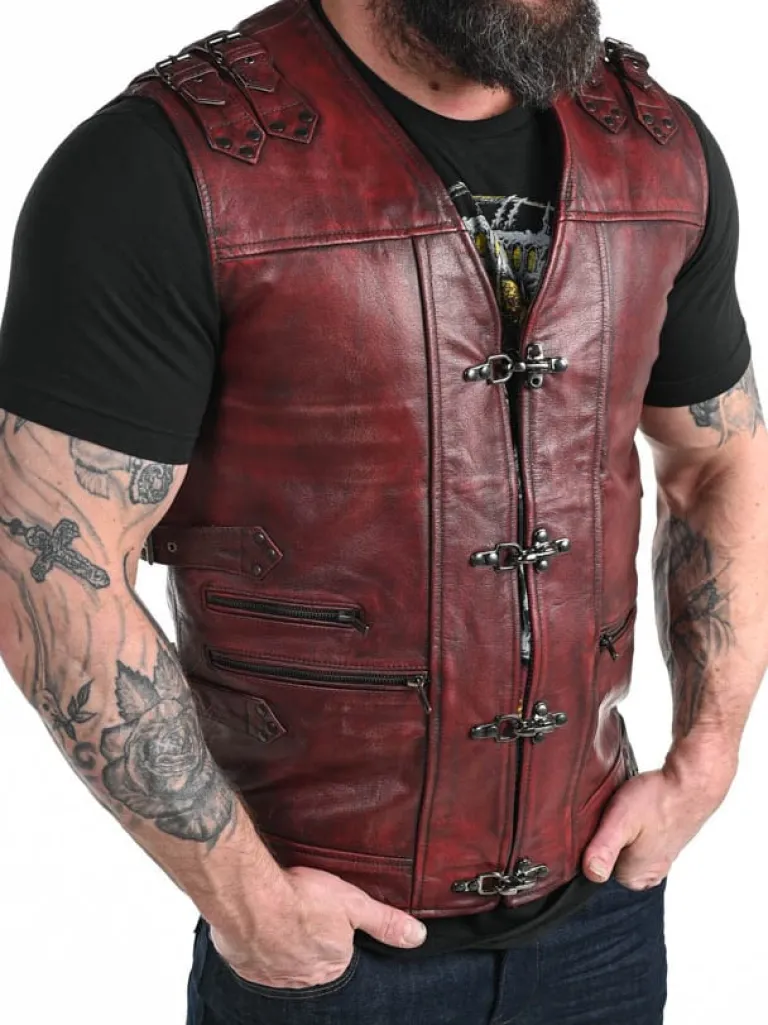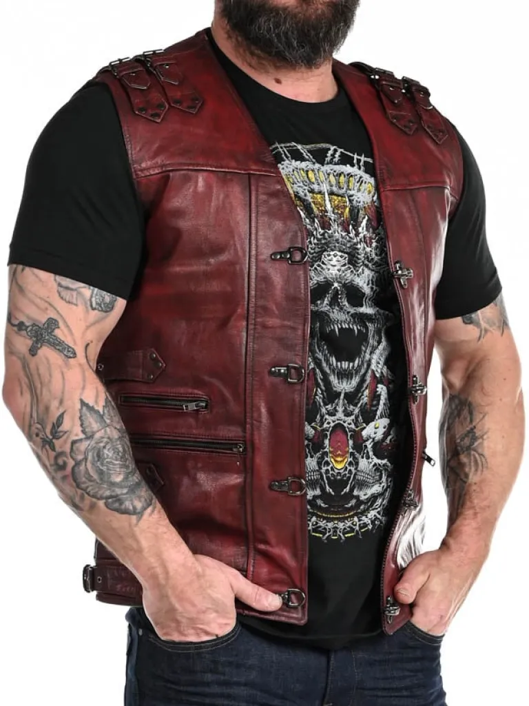 Rød Skindvest Med Nitter I Et Sølvskinnende Materiale, Lynlåse Og Remme. Maskulint Design Med Markerede Skuldre, V-Udskæring Foroven Og Regulérbare Spænder På Siderne. Materialer Er Groft Og Tåleligt. Der Findes To Inderlommer Og Tre Lommer Fortil, Som Kan Lukkes Ved Hjælp Afaftige Lynlåse.