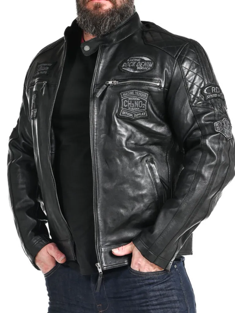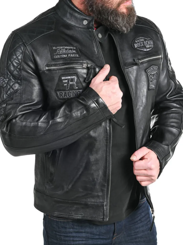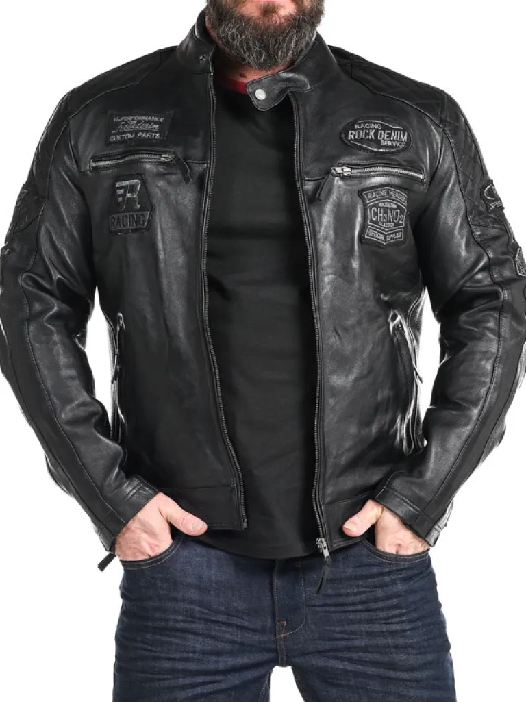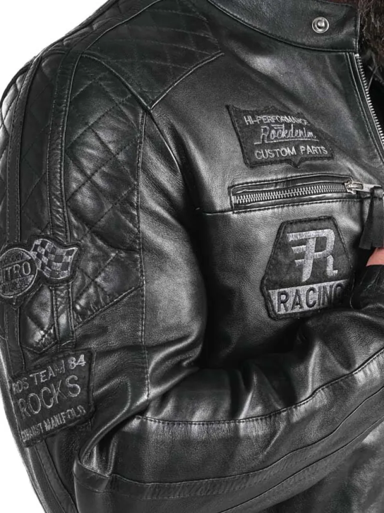 Racingjakke Fra sort Læderjakke I Ægte Læder Med Flotte Lapper. Den Har Et Quiltet Parti På Skuldrene, Og Er Funktionelt Udrustet Med Lommer, Der Kan Lukkes. Hertil Kommer Ender På Ærmerne Der Kan Justeres. Jakken Kan Endvidere Lukkes Med Trykknapper Ved Halsen. Denne Unikke Jakke Er Fremstillet I Et Kvalitetslæder, Og Er Desgignet Af Med Inspiration Fra Motorsporten.