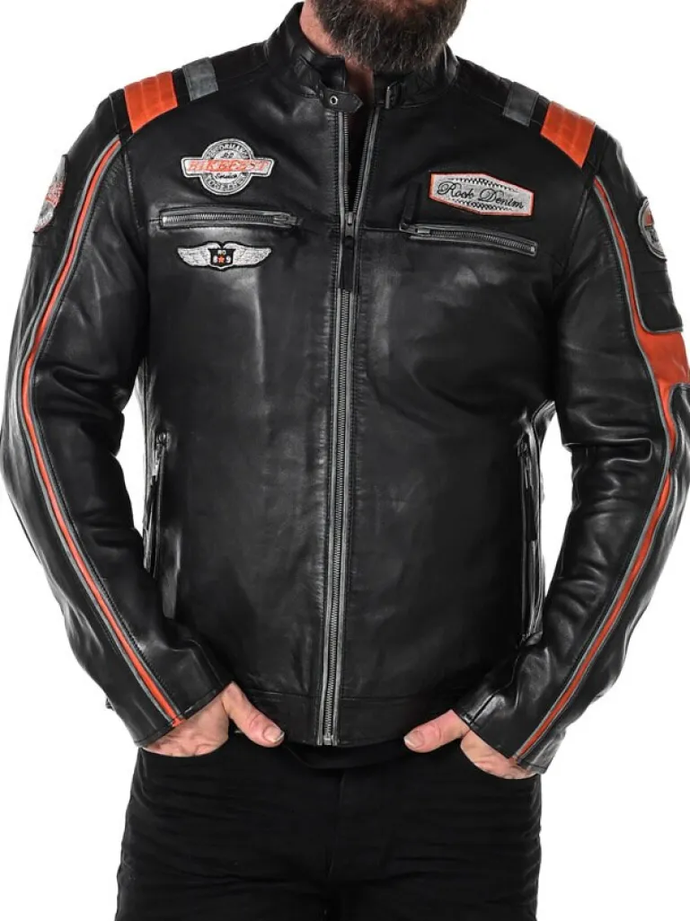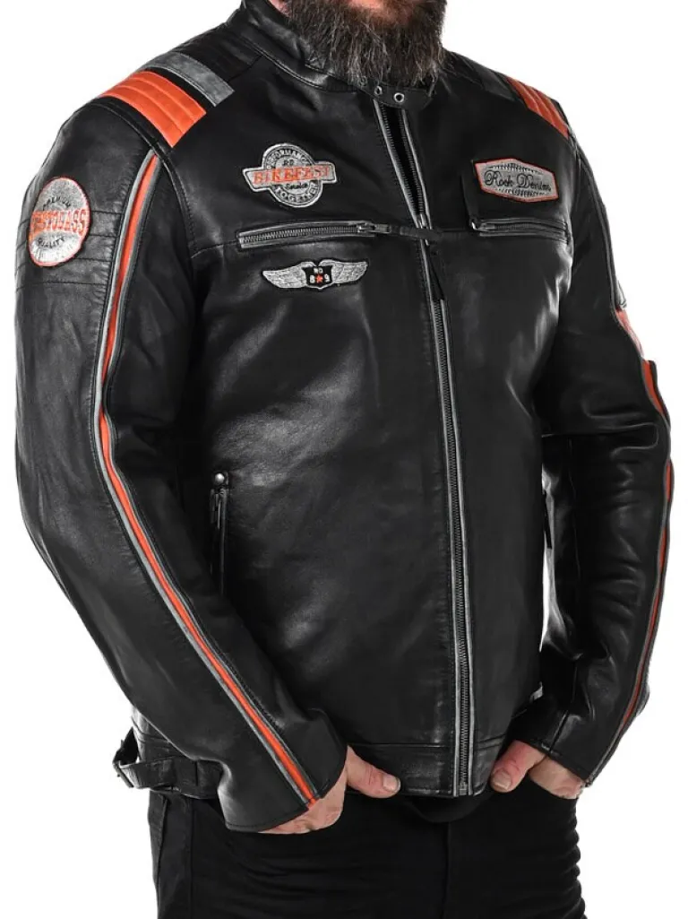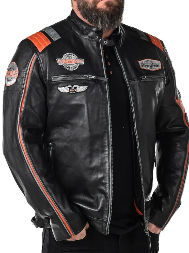 Cool Læderjakke Fra jakke I Kvalitetslæder Med Striber Og Lapper, Der Kommer I Grå Og Orange. Den Er Praktisk Designet Med Lommer, Der Kan Lukkes. Hertil Kommer, At Enden Af Ærmerne Kan Justeres. Der Findes Desiden Et Spænde På Hver Side Forneden, Så Du Kan Spænde Den Ind Til Den Rette Bredde. Denne Unikke Læderjakke Er Designet Af Med Inspiration Fra Motorsporten.