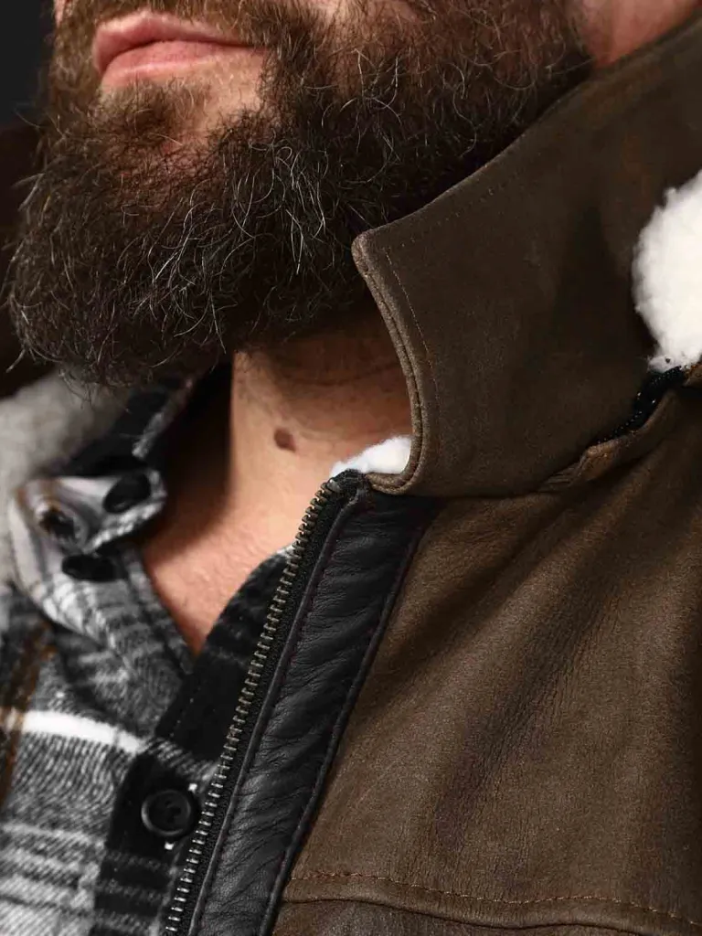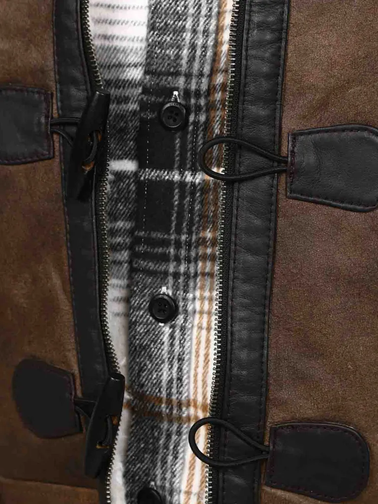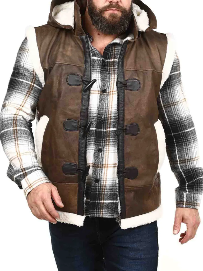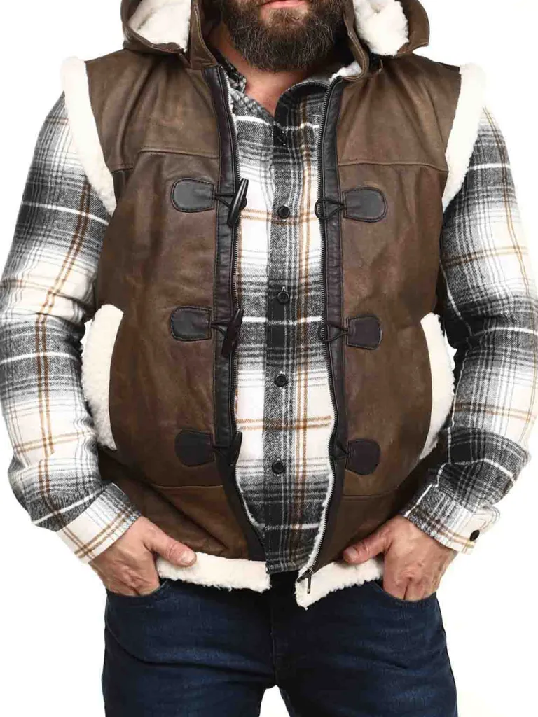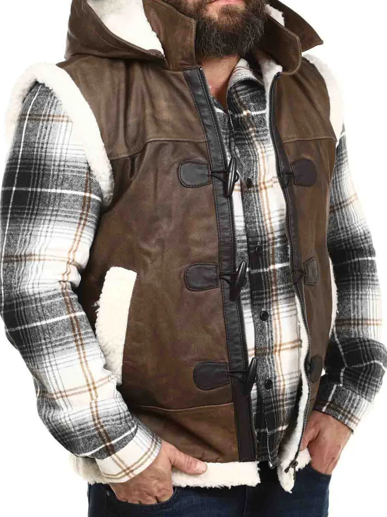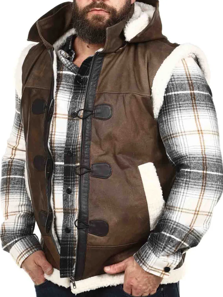 Eksklusiv Lædervest Fra Exclusivebrun Vest I Ægte Læder Med En Aftagelig Hætte Og Et Hvidt Teddyfor. Den Har To Dybe…